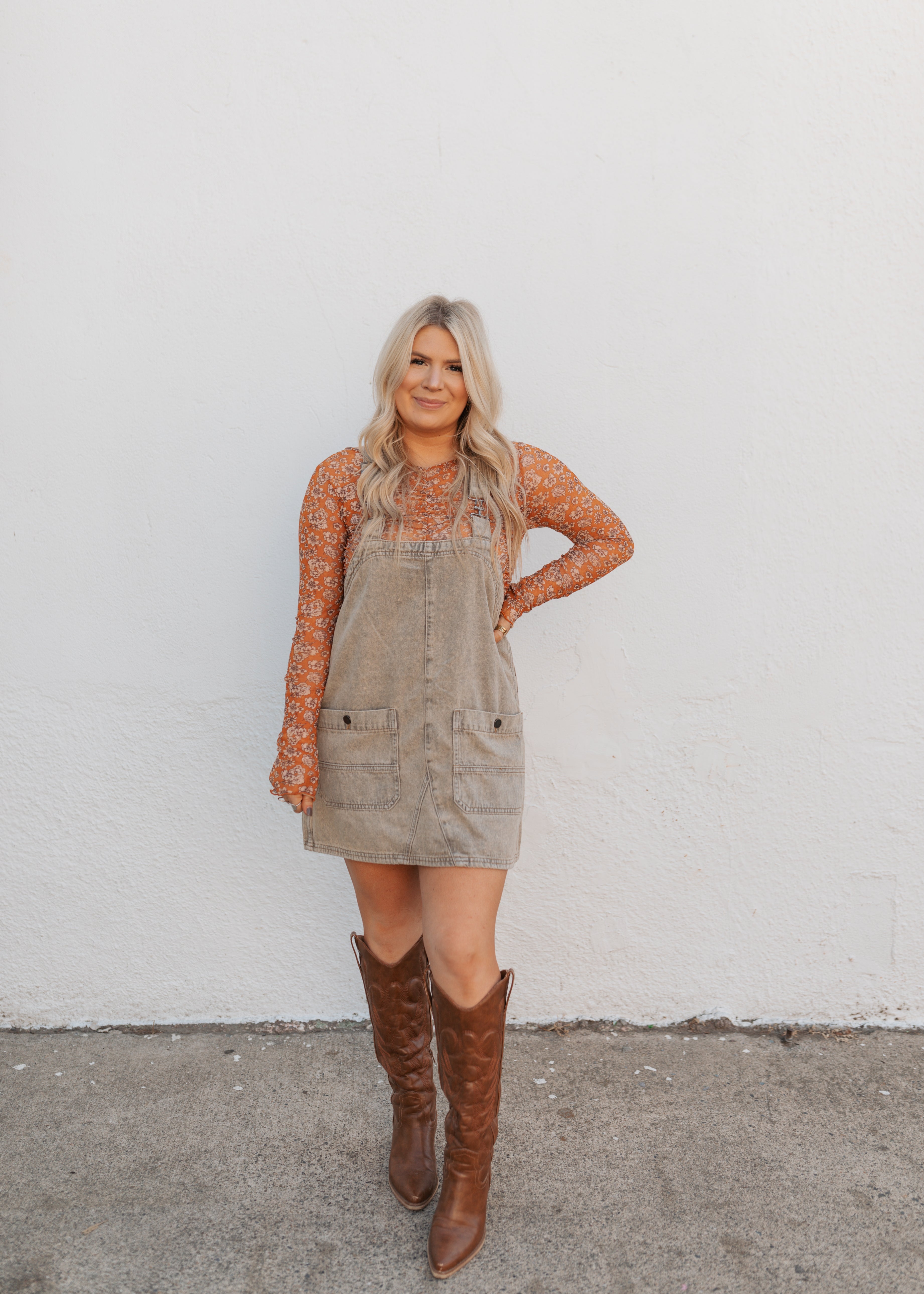 Snow wash hazelnut color overall dress with adjustable straps and front pockets.