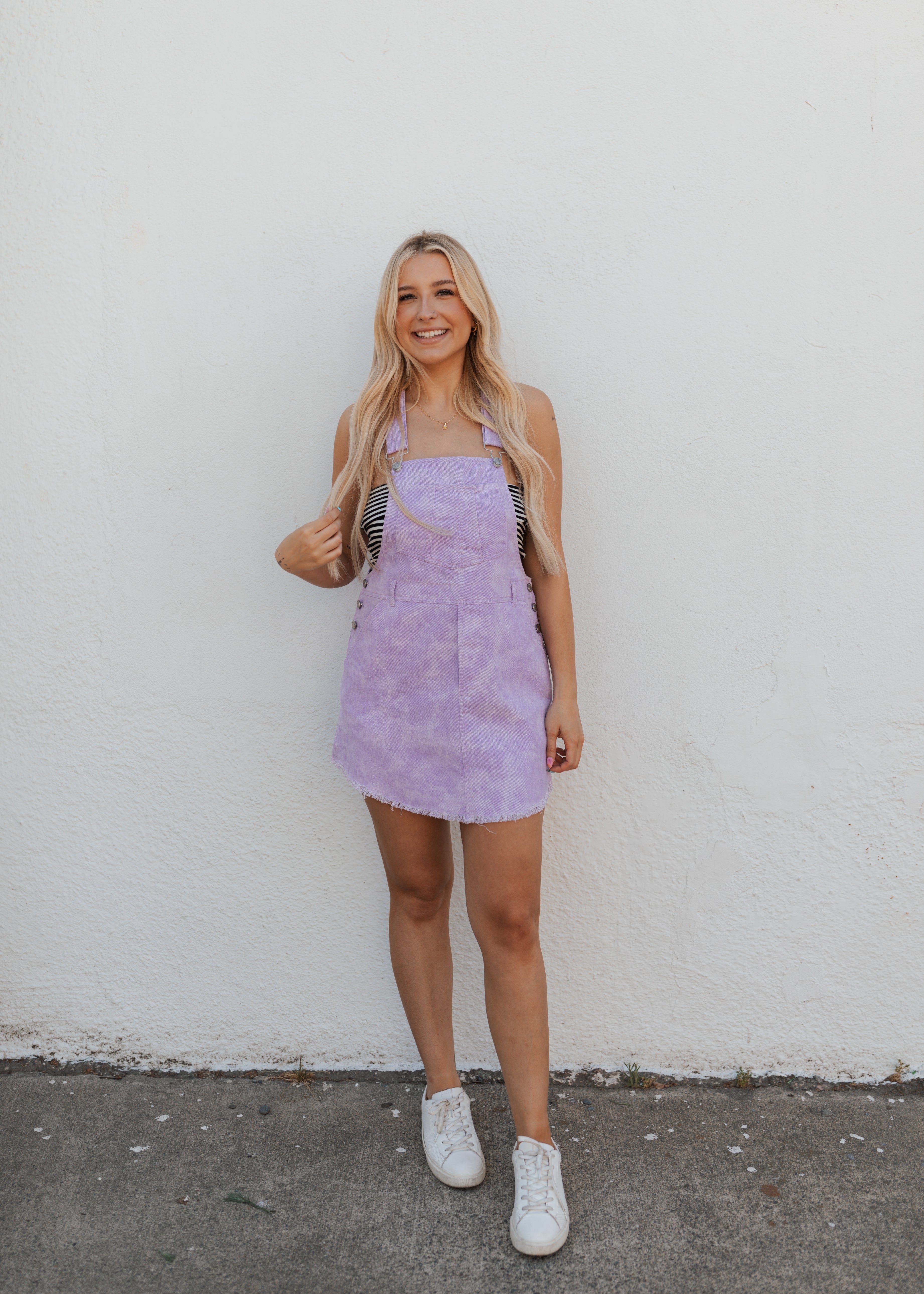 GARMENT DYED POCKETED RAW HAM OVERALL MINI DRESS-LILAC