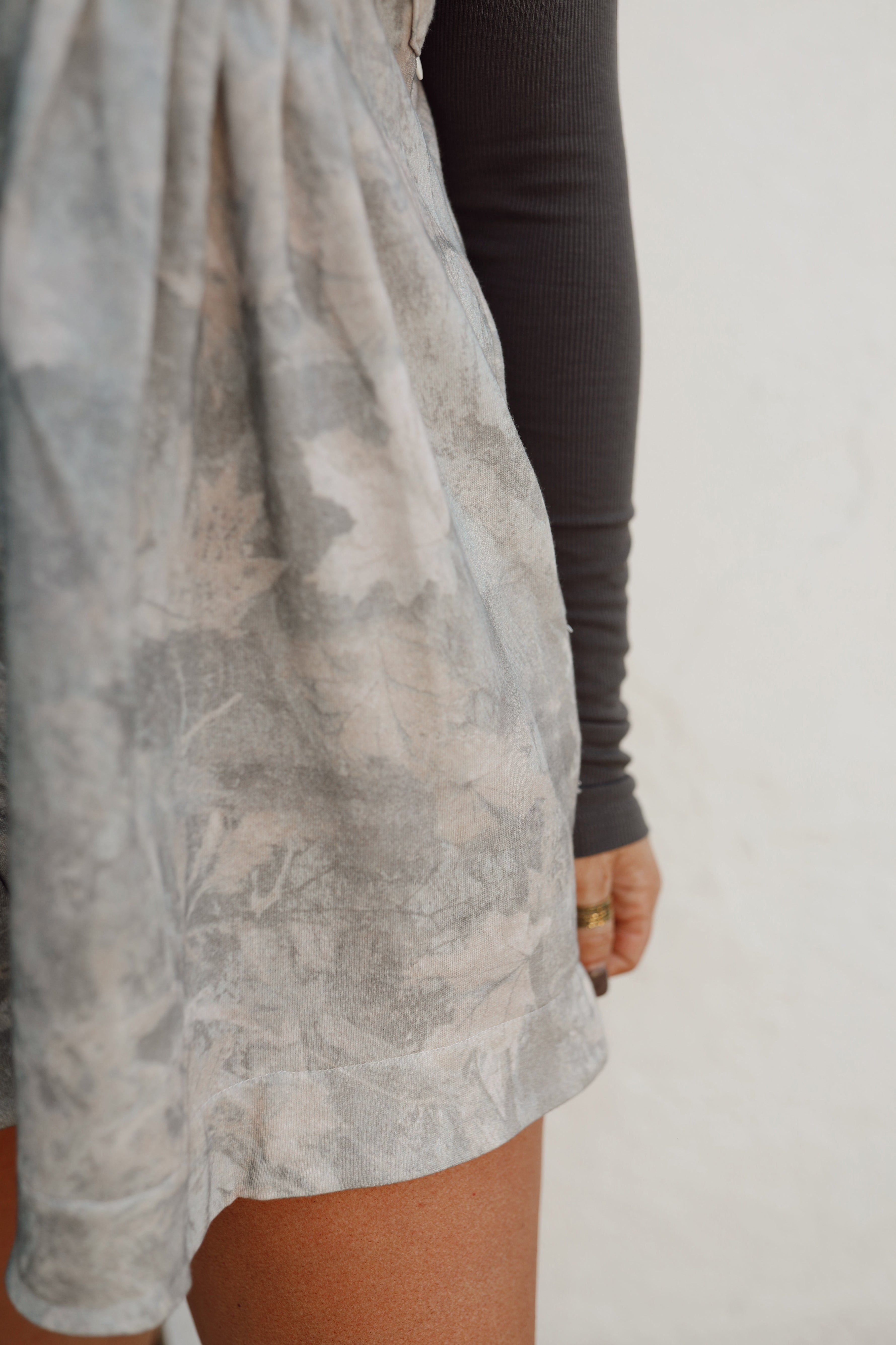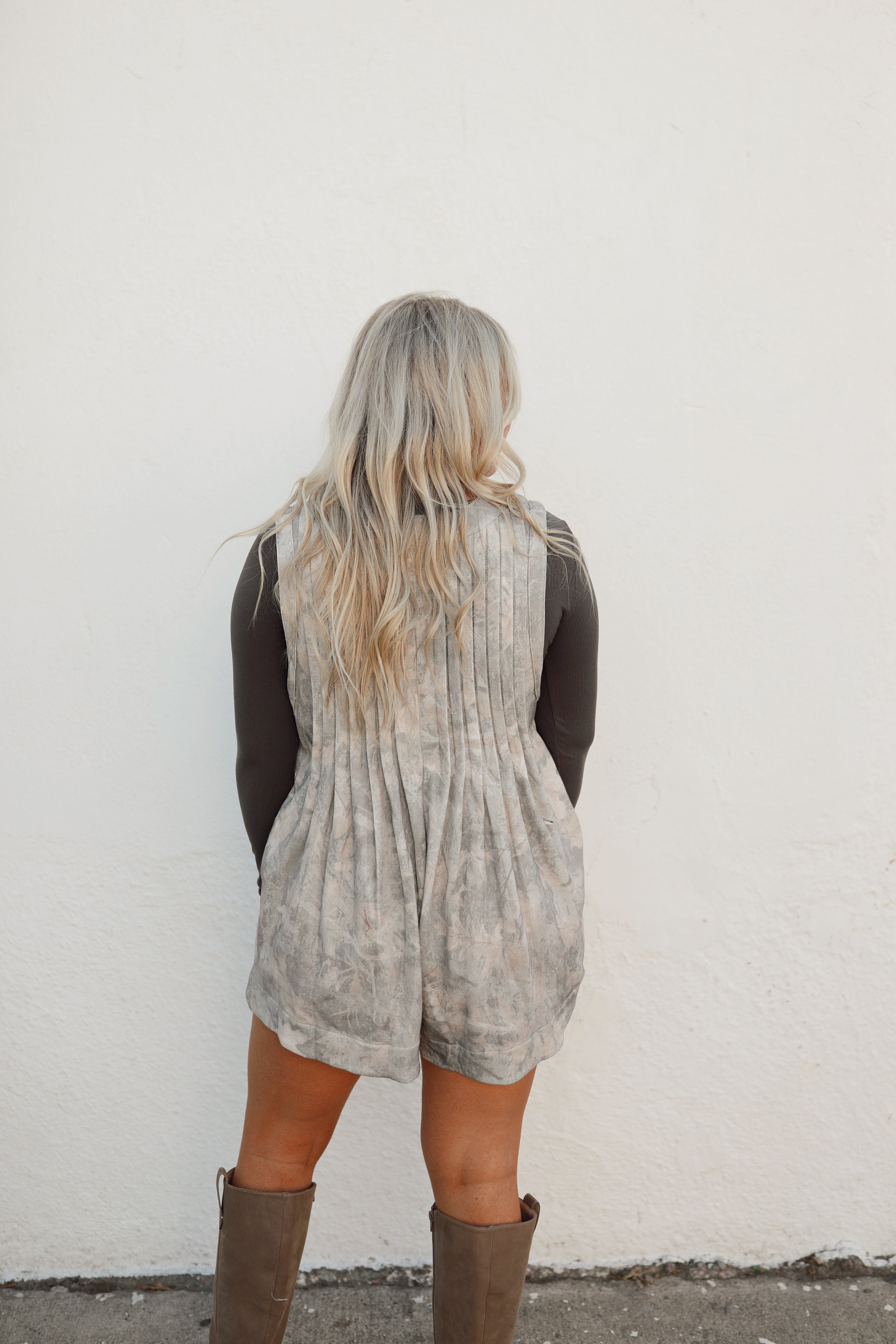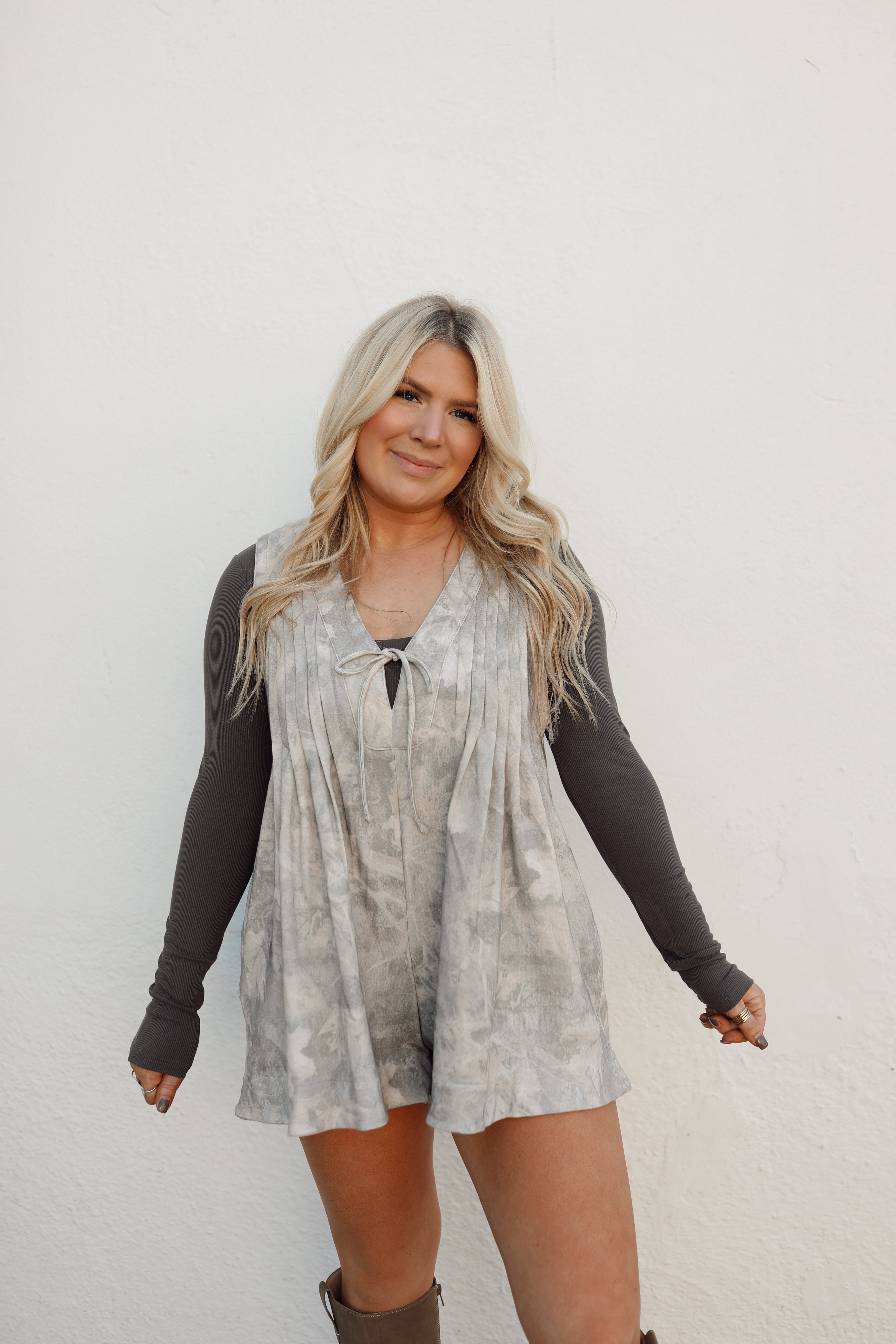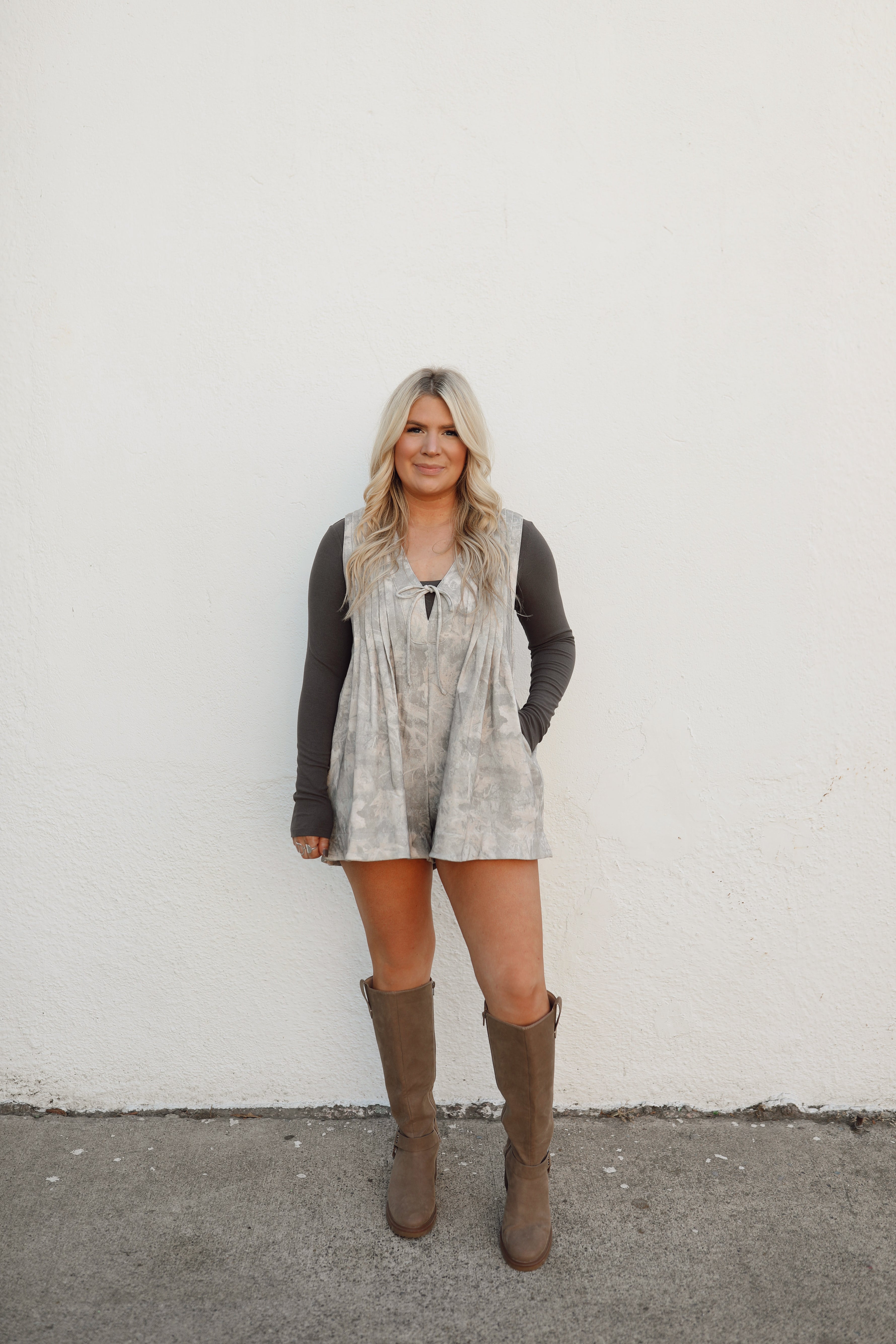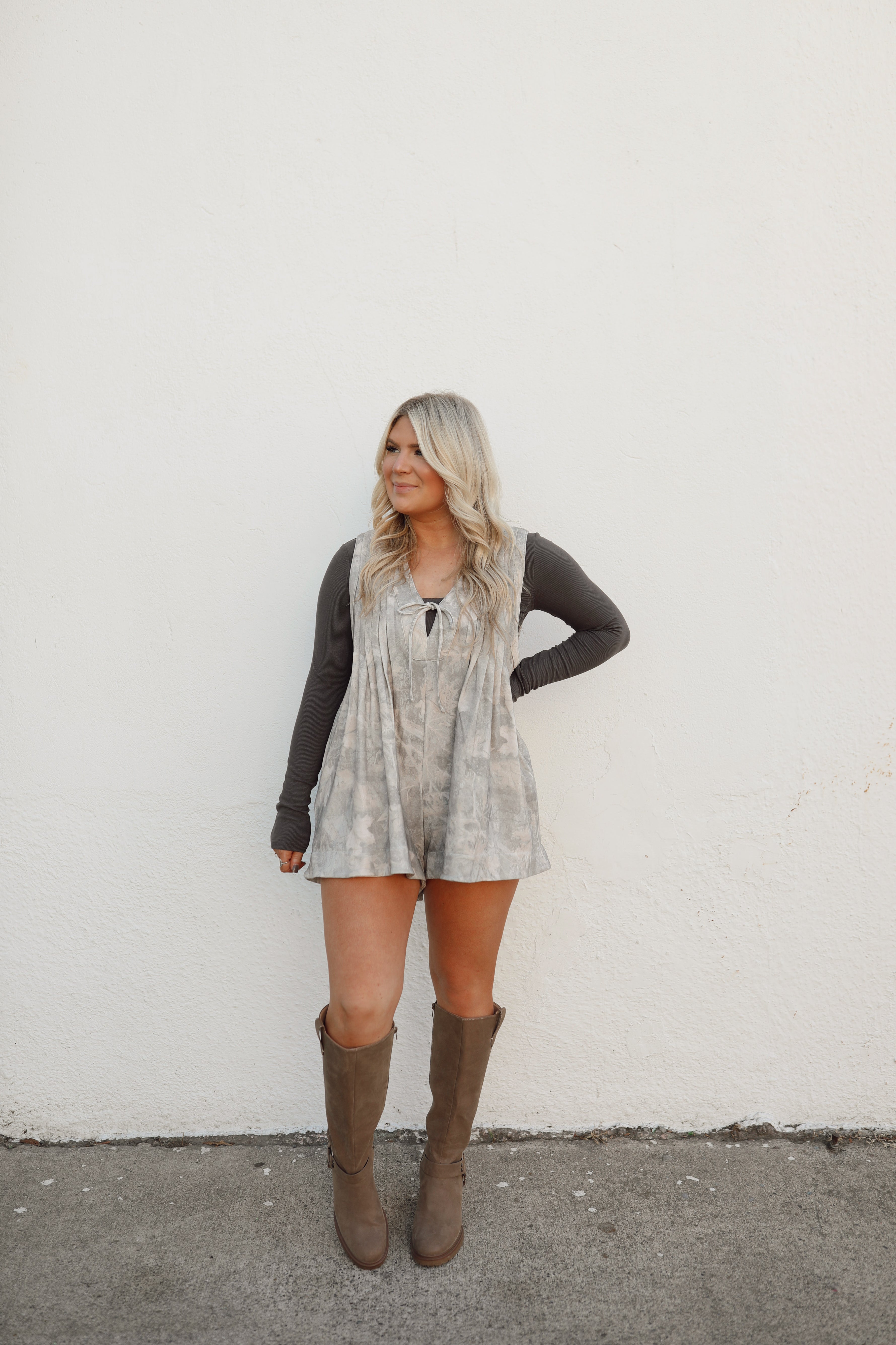 Camo terry cloth material romper with a side zipper to get into and side pockets. Runs true to size.