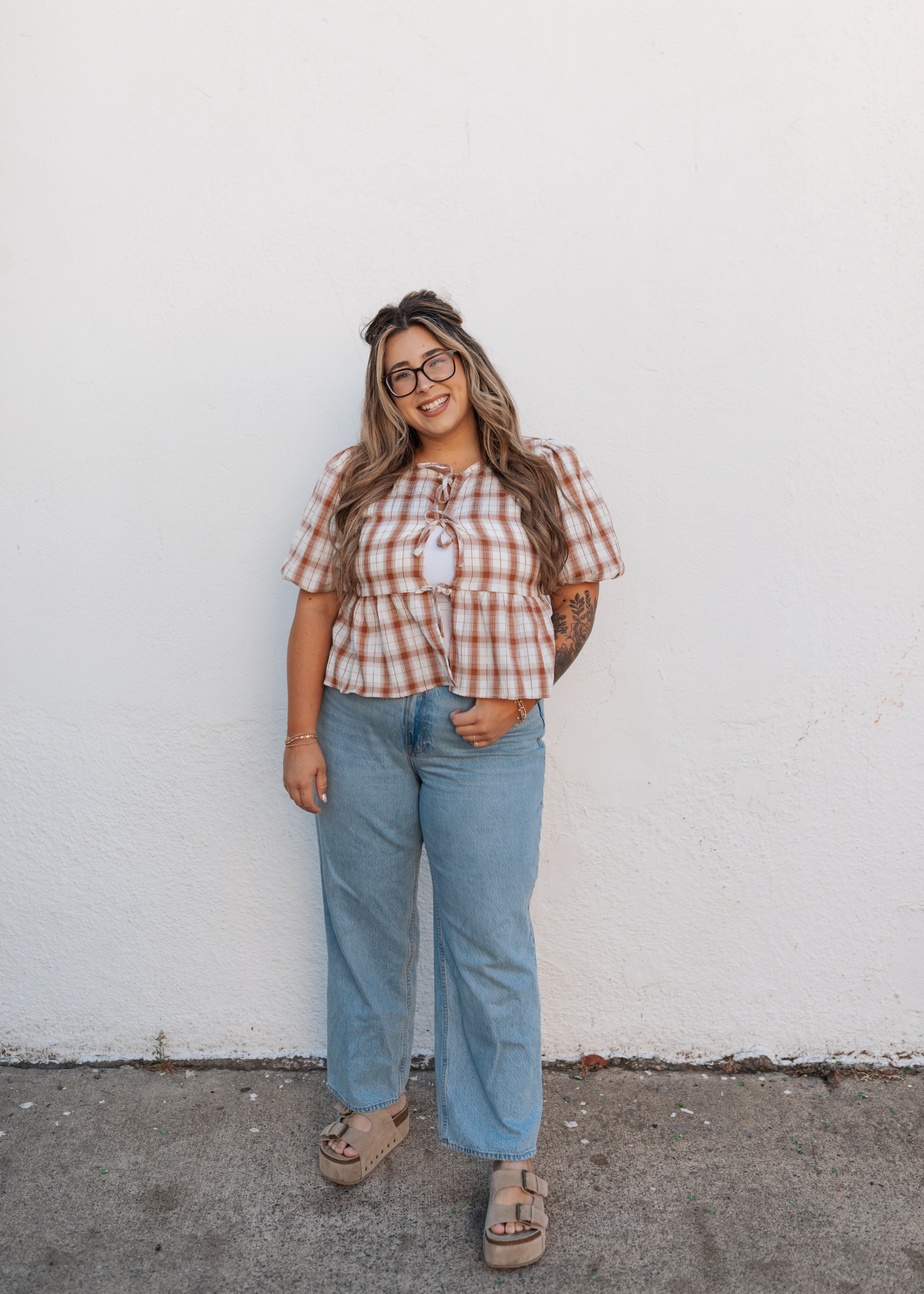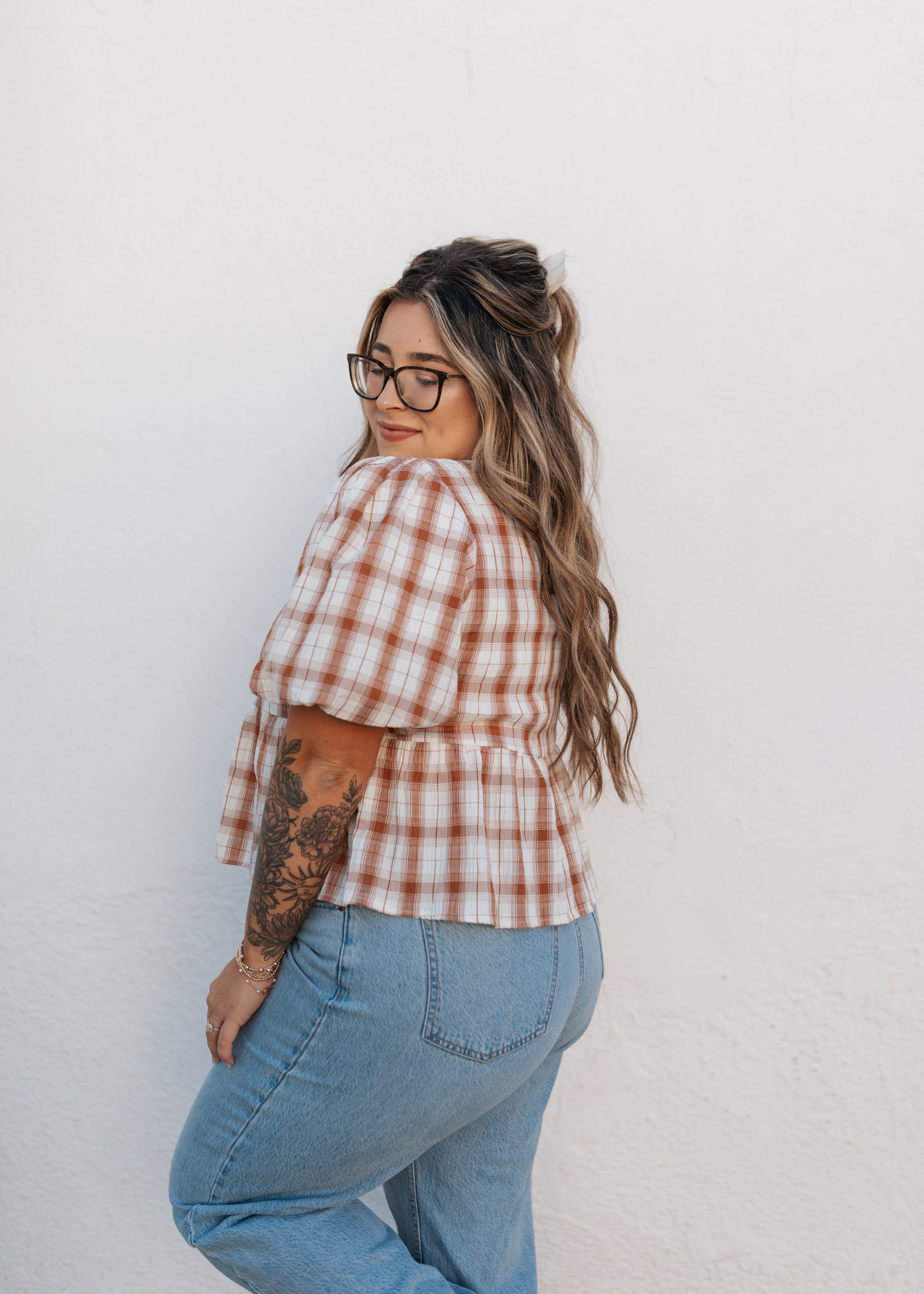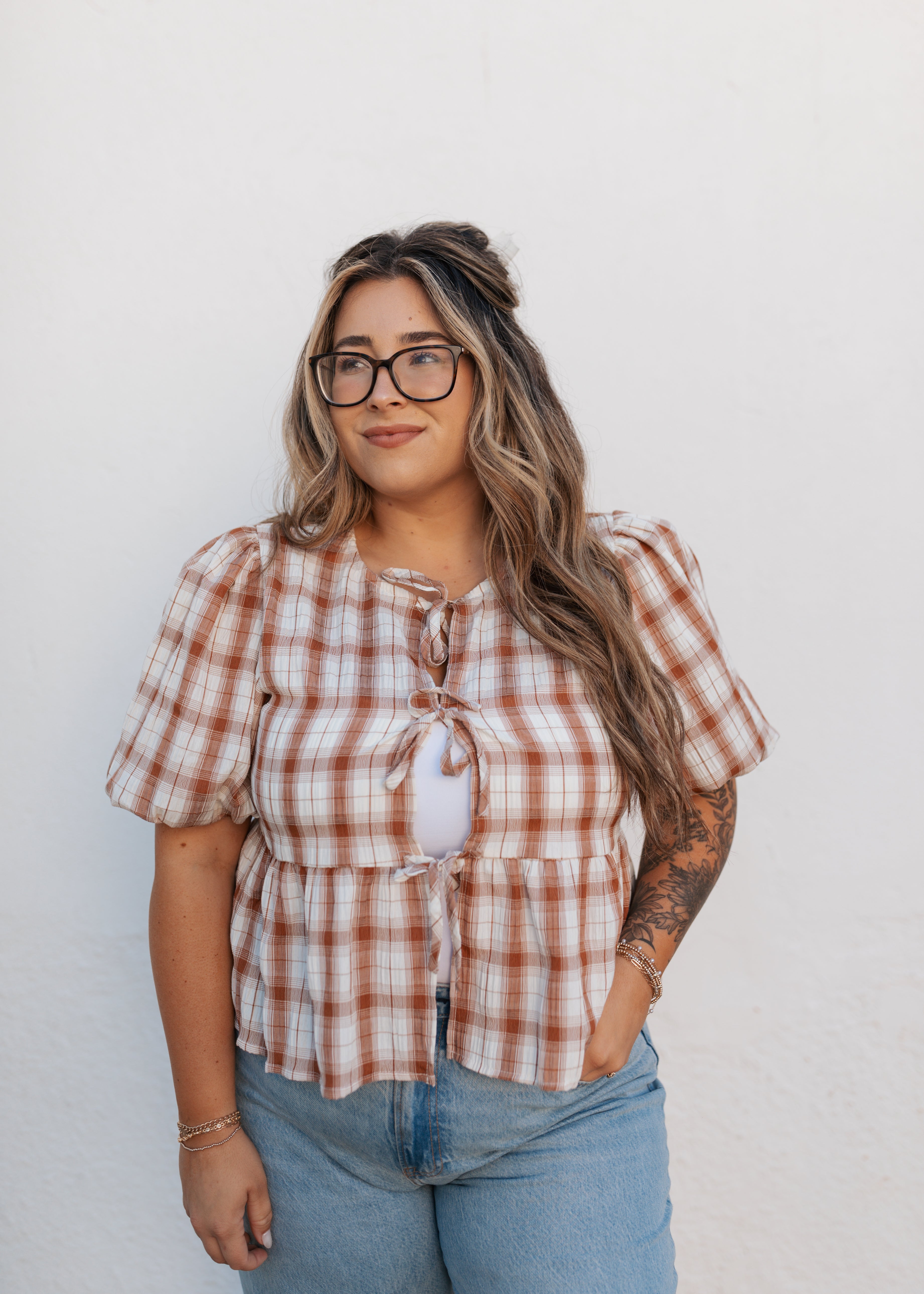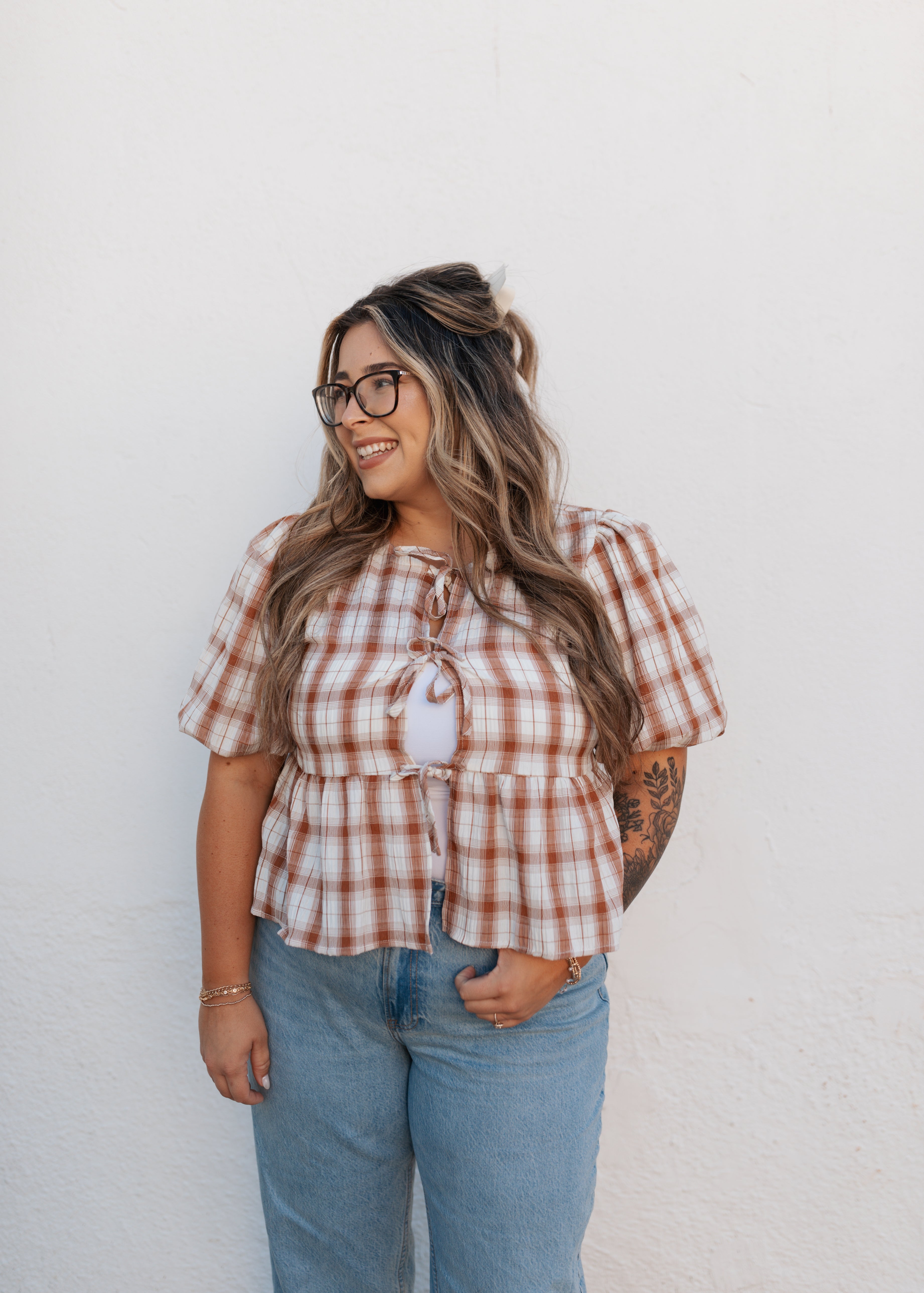 Burnt orange and cream plaid tie top