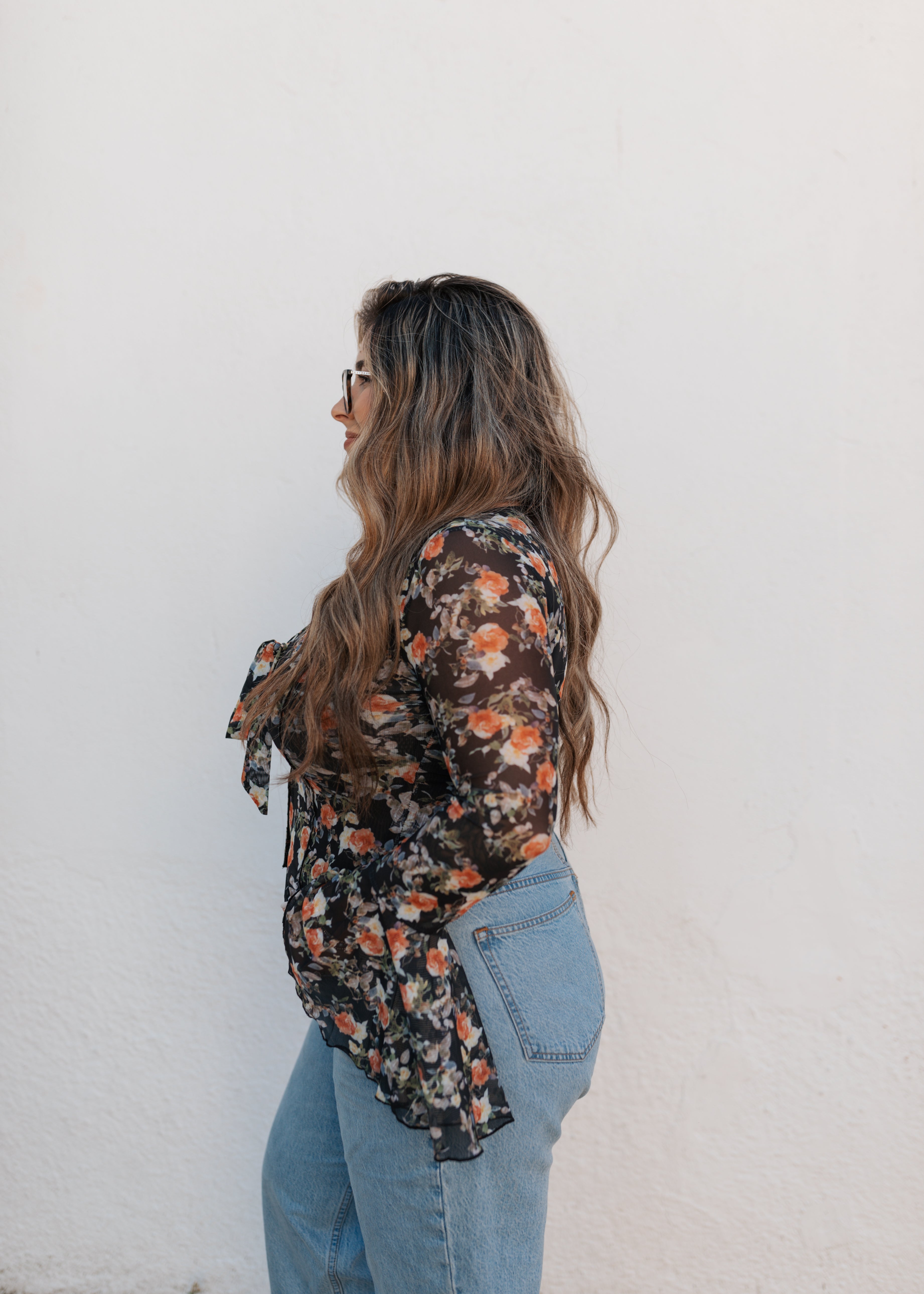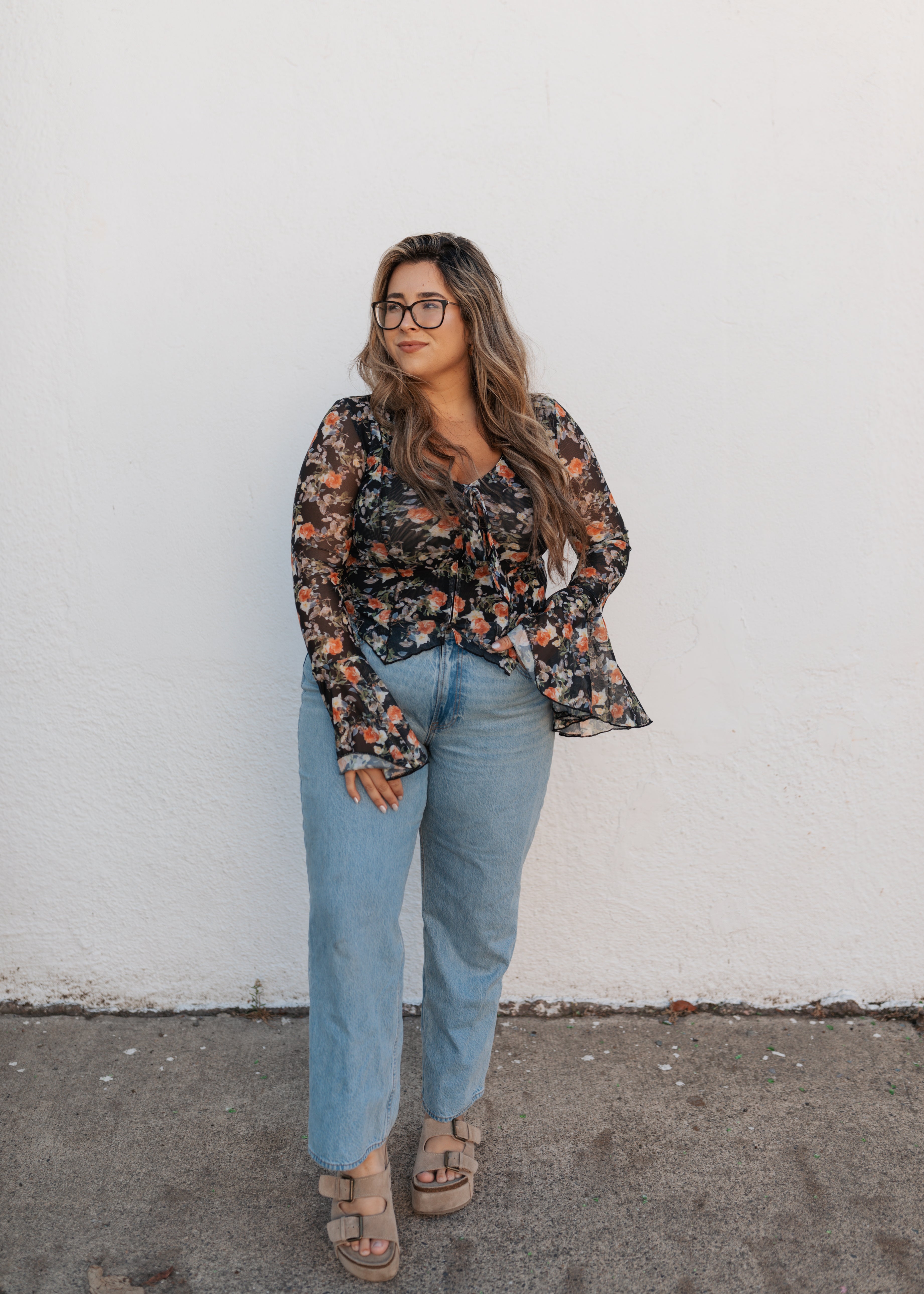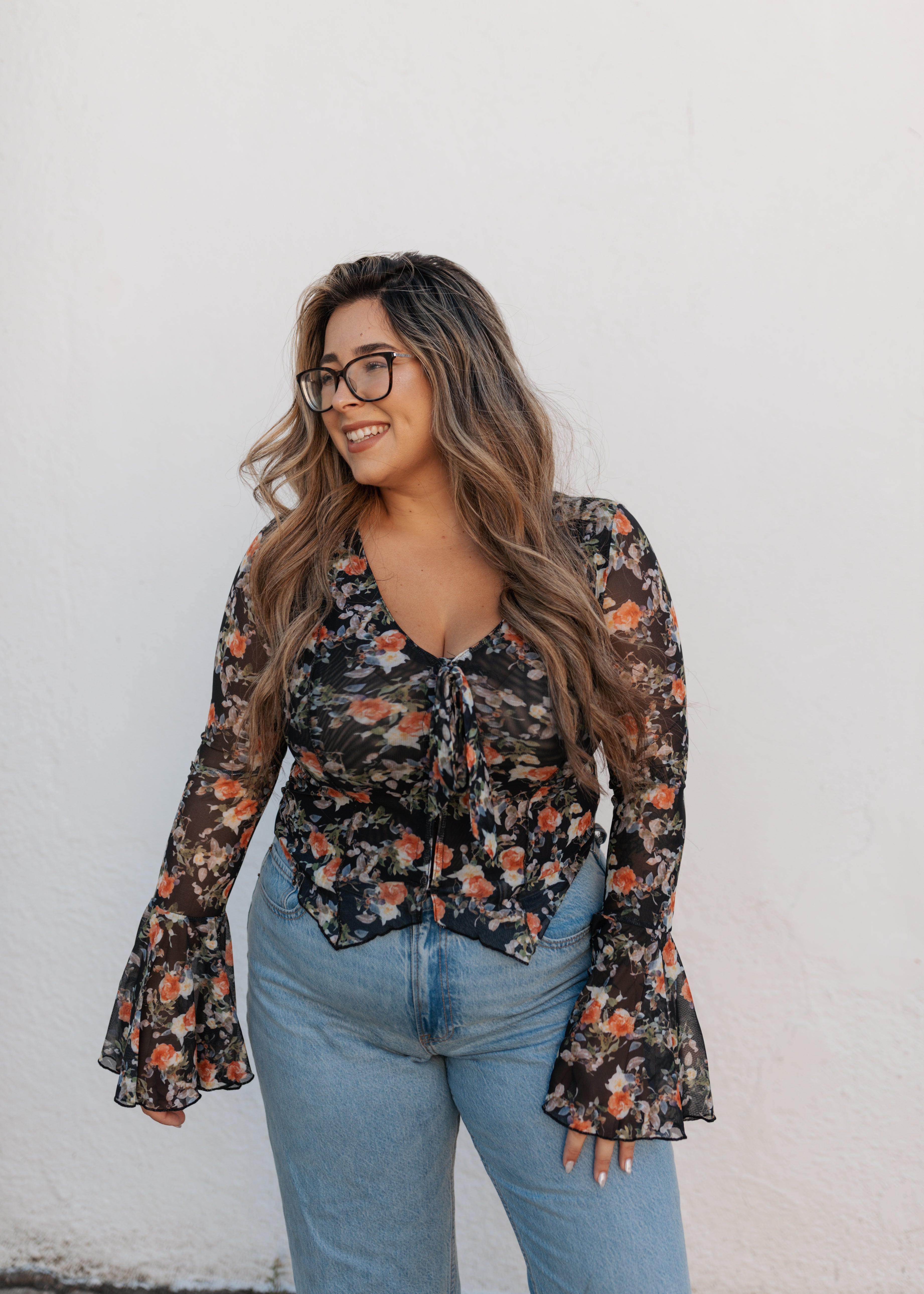Long sleeve black with neutral florals bell sleeve top
