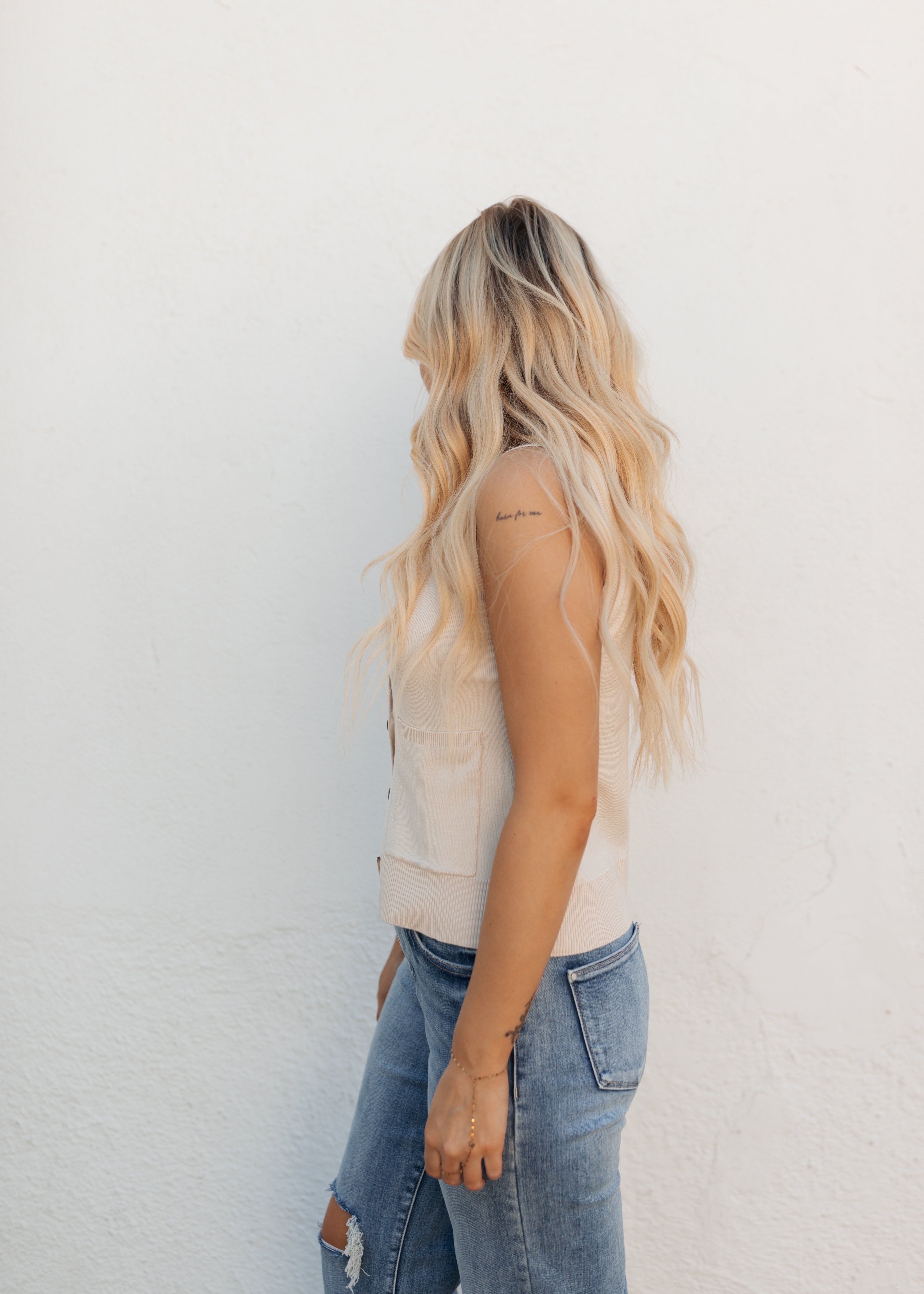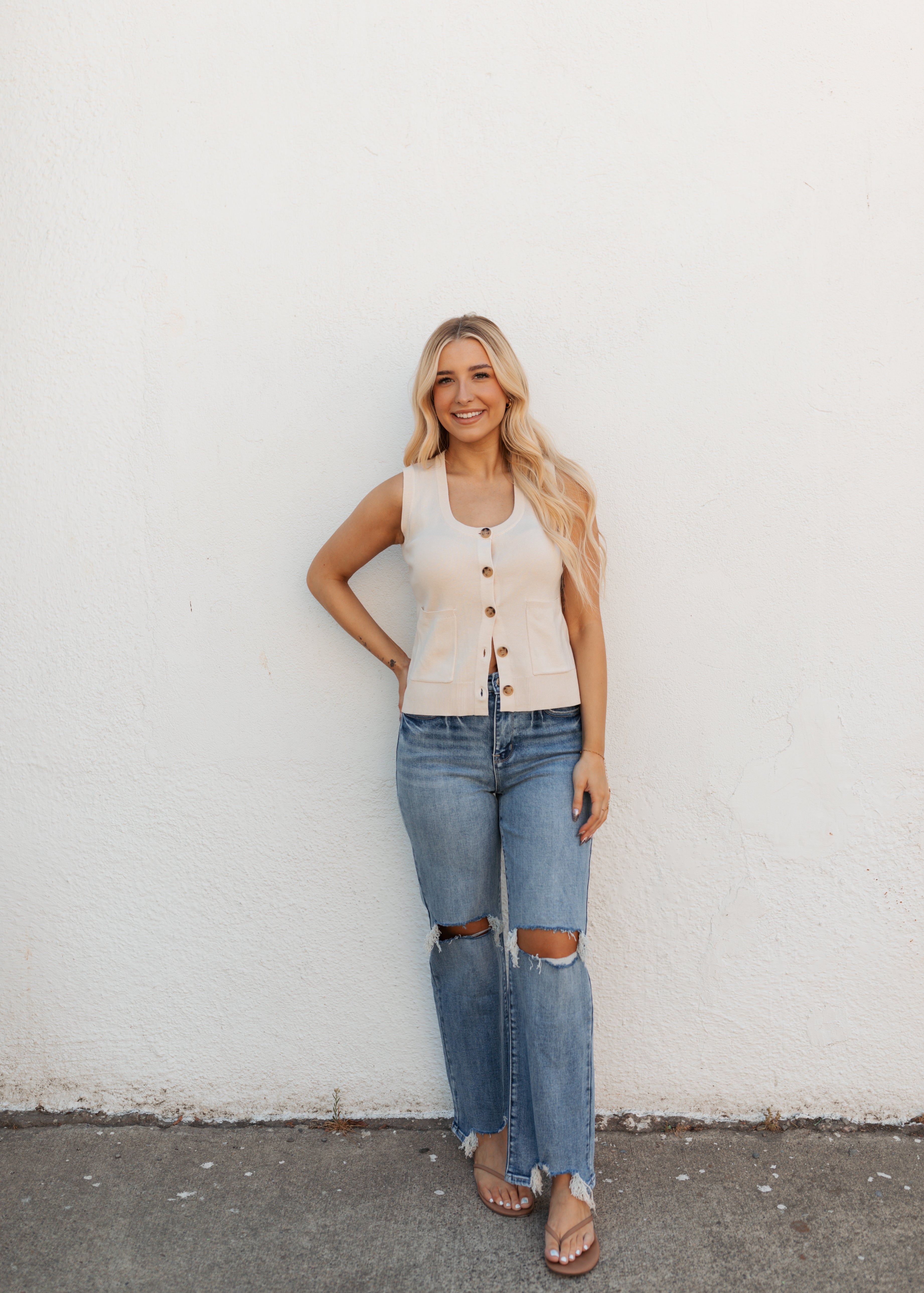Button up sweater vest top with front pockets slouchy fit