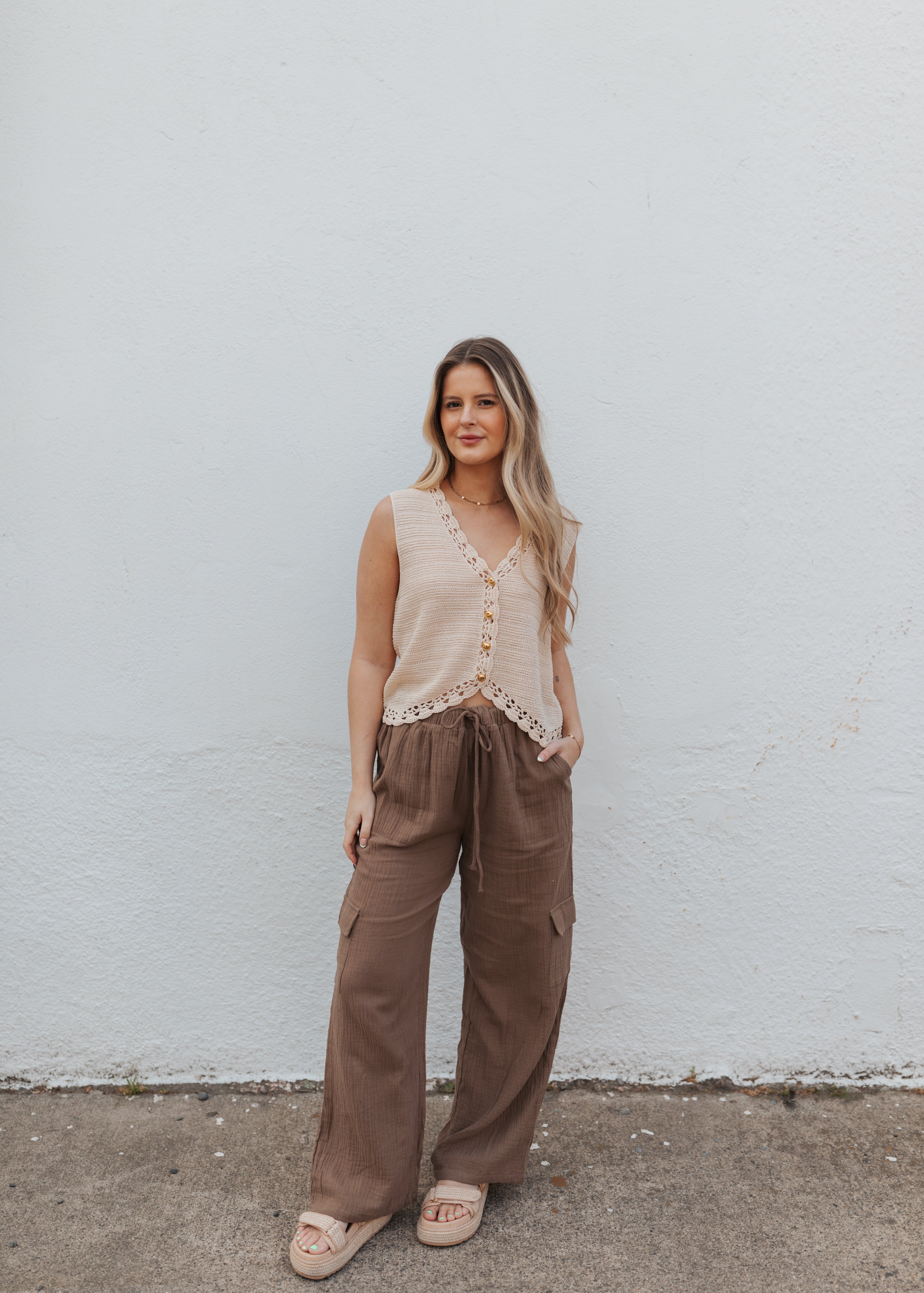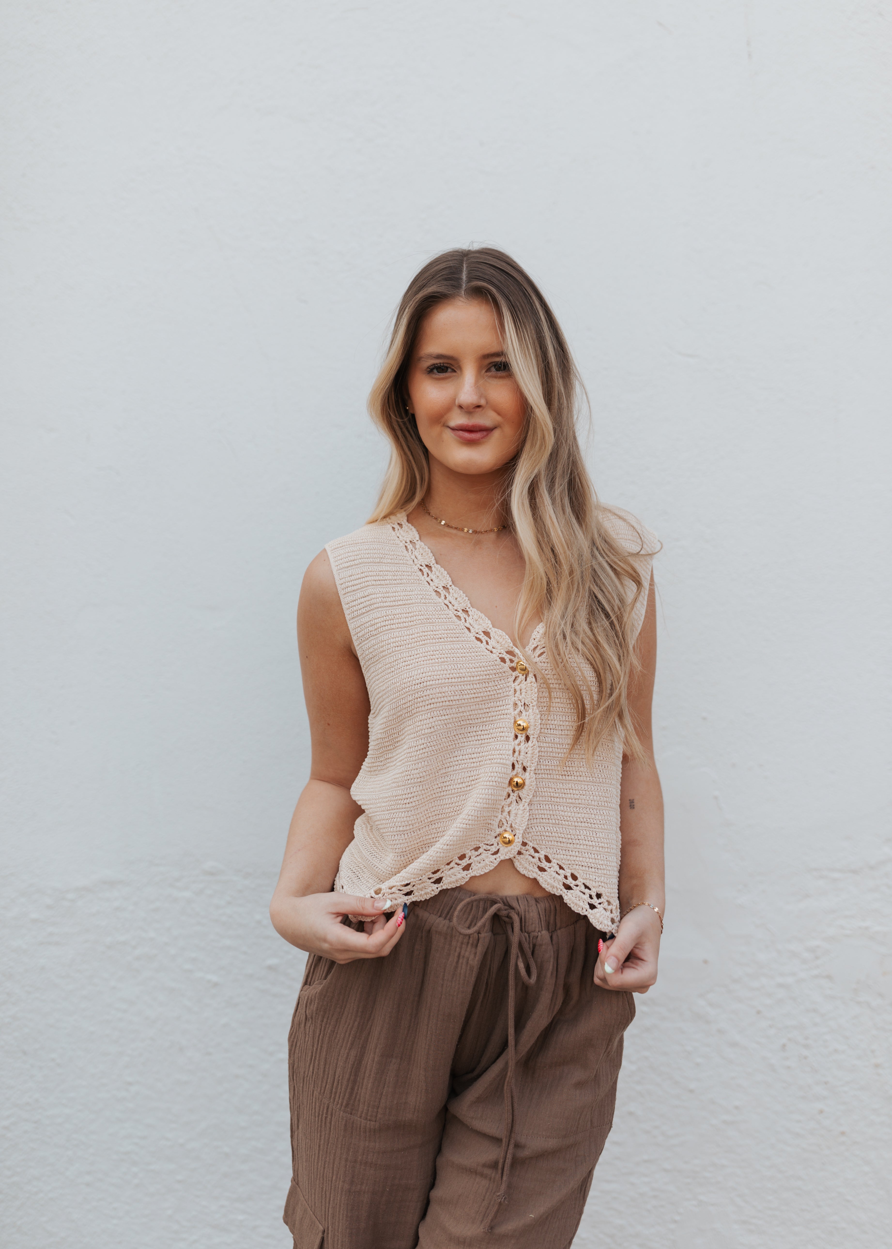 Crochet trimmed button down vest