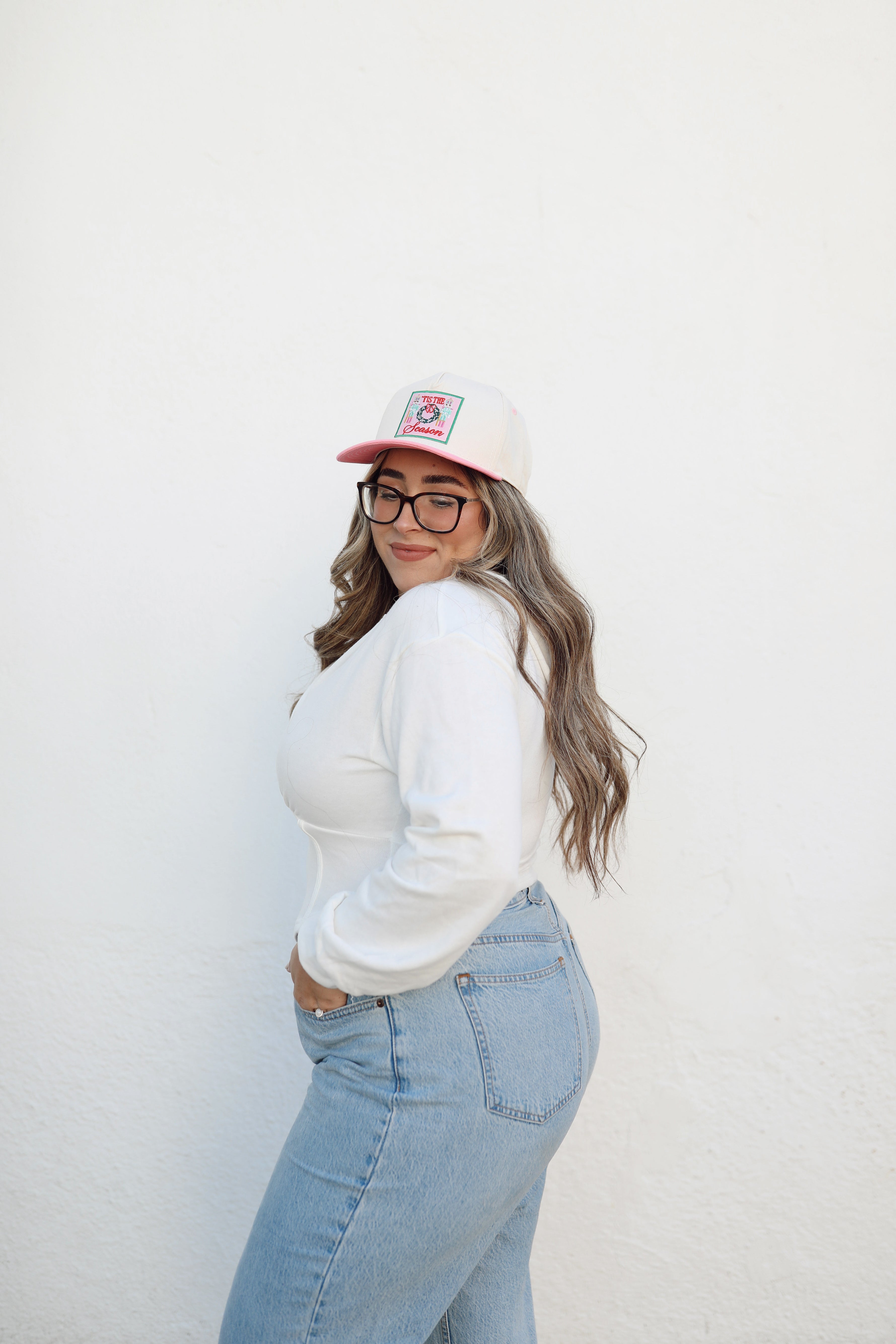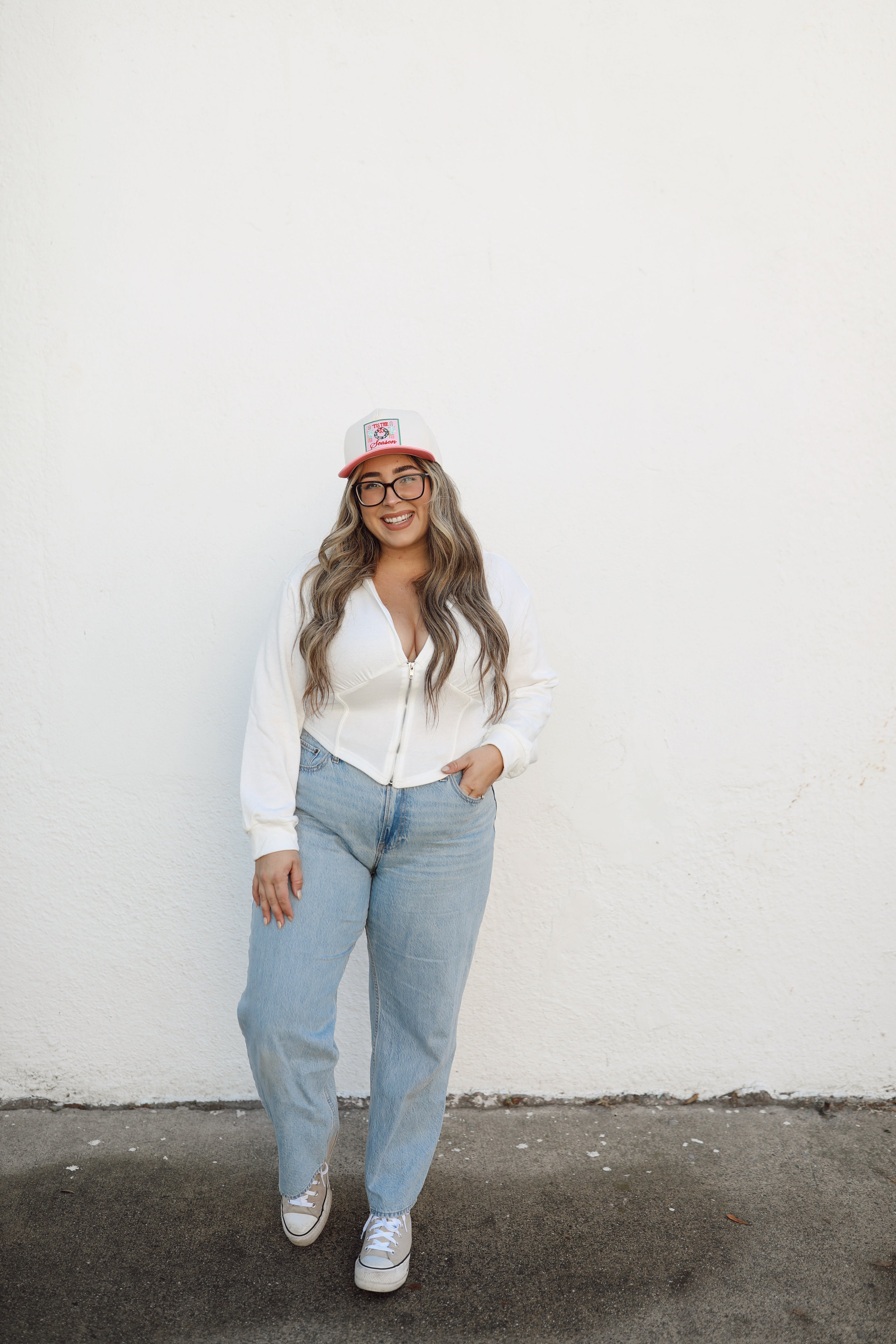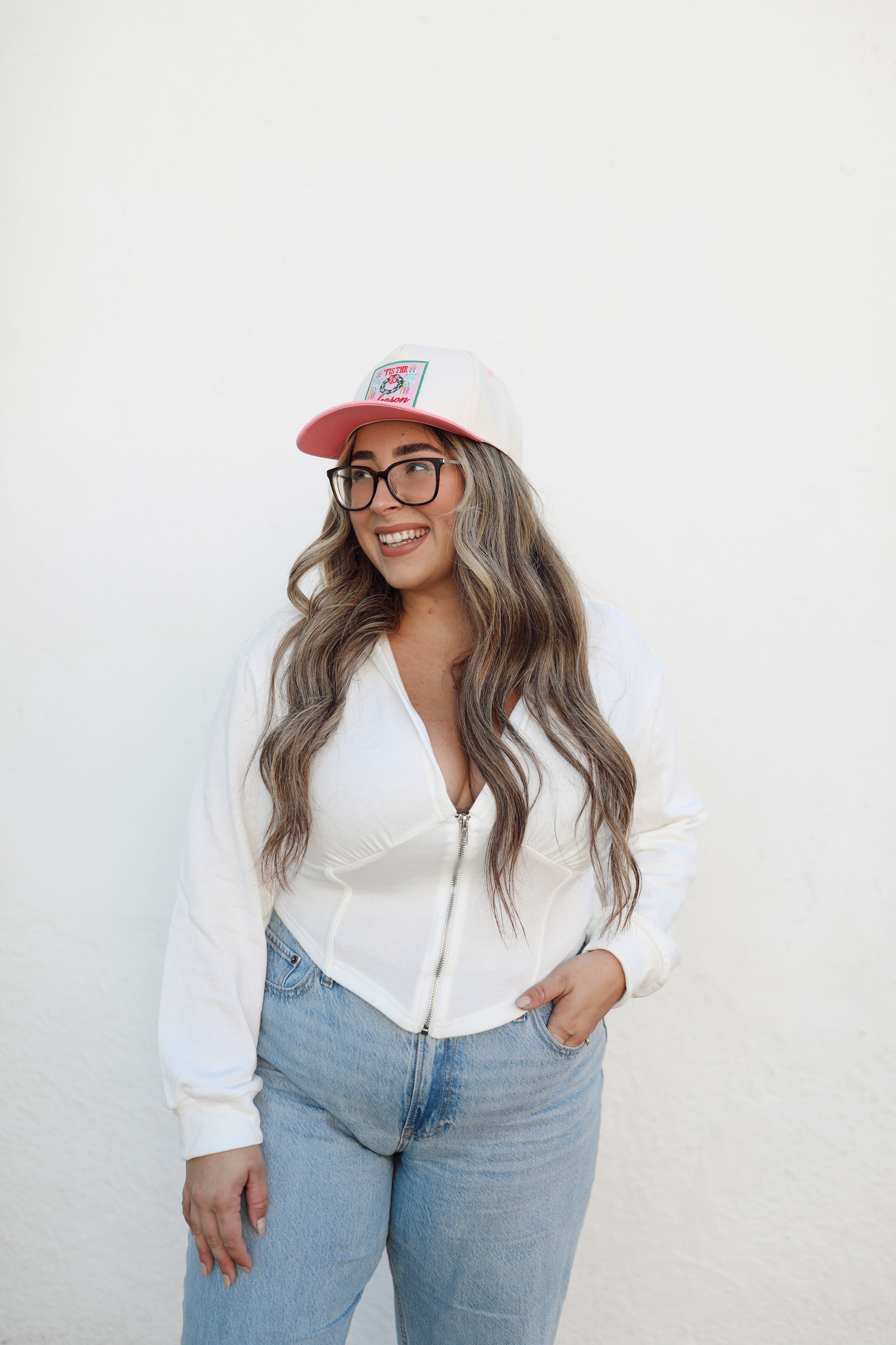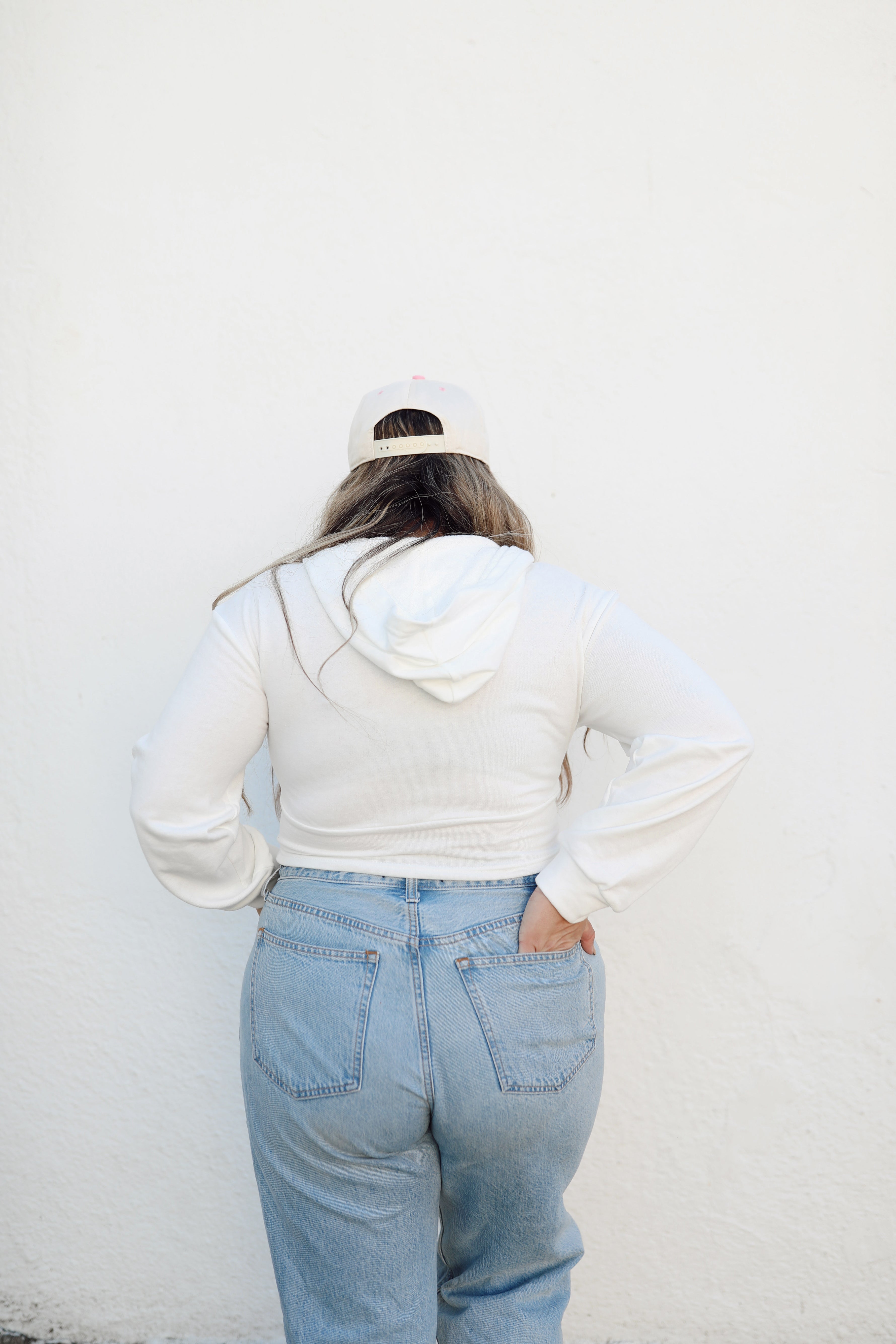 White v neck hoodie with a corset illusion in front with full zip, cropped