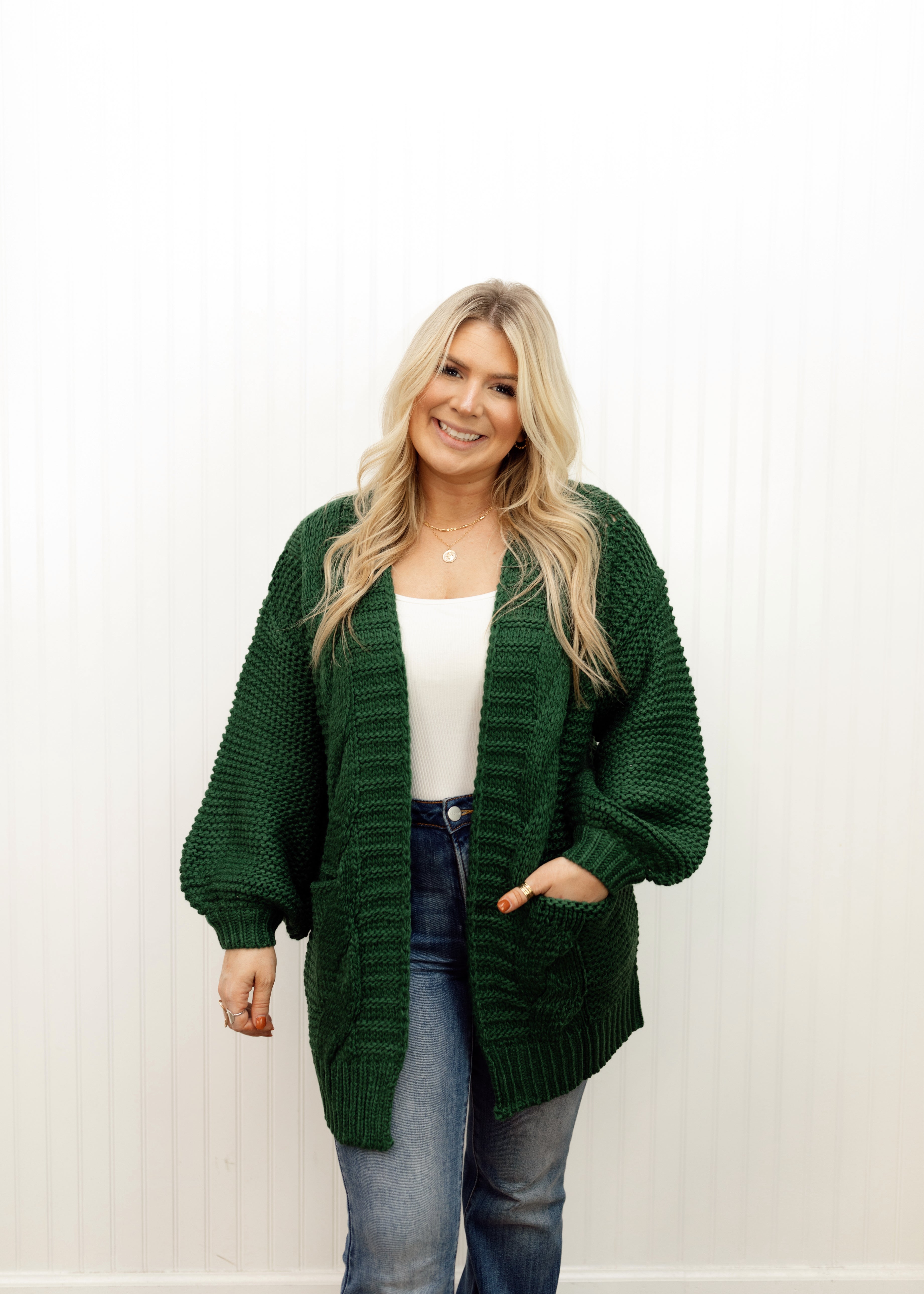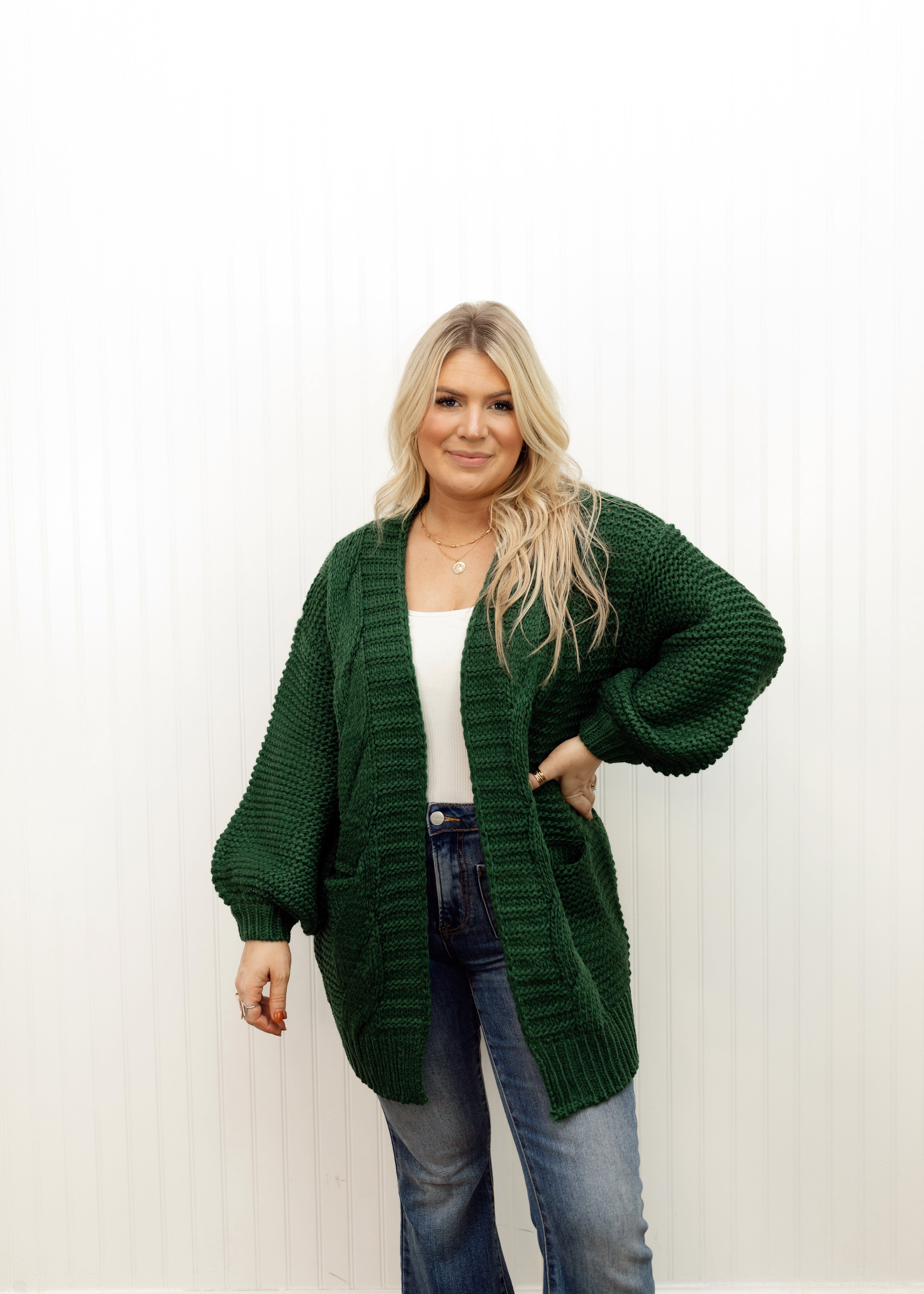 A chunky cable knit cardigan featuring an open front, front patch pockets, long lantern sleeves, and a relaxed fit.