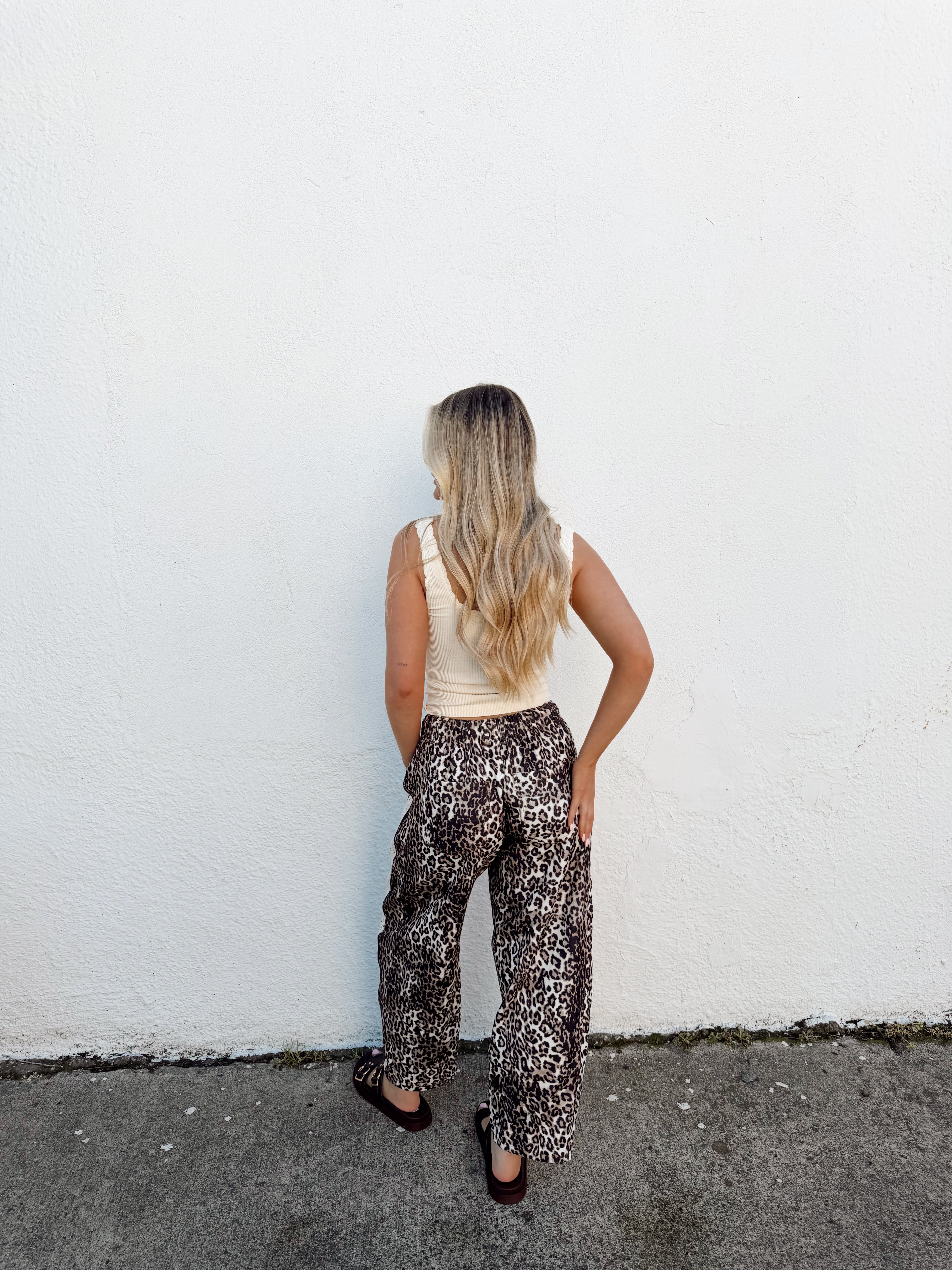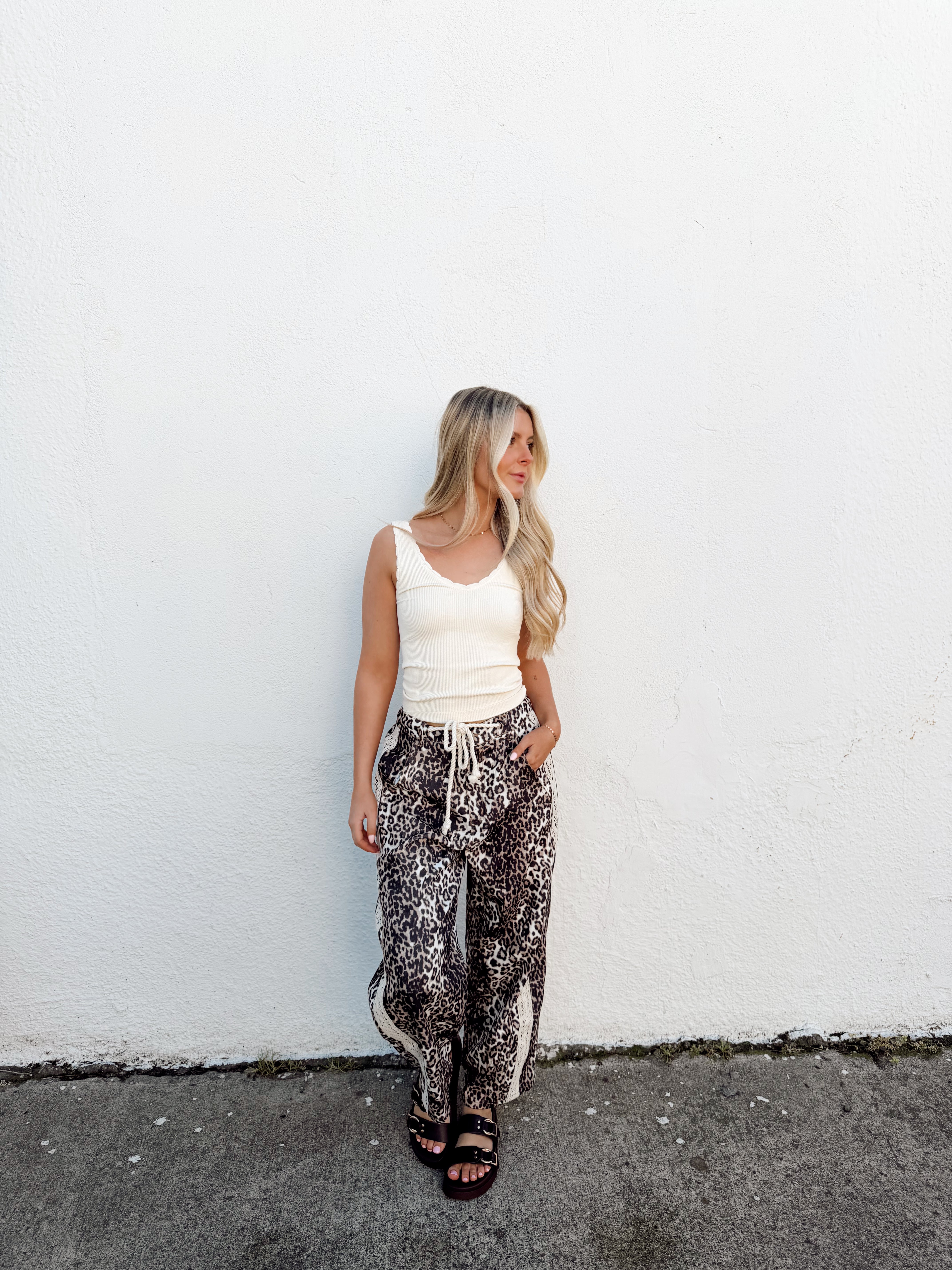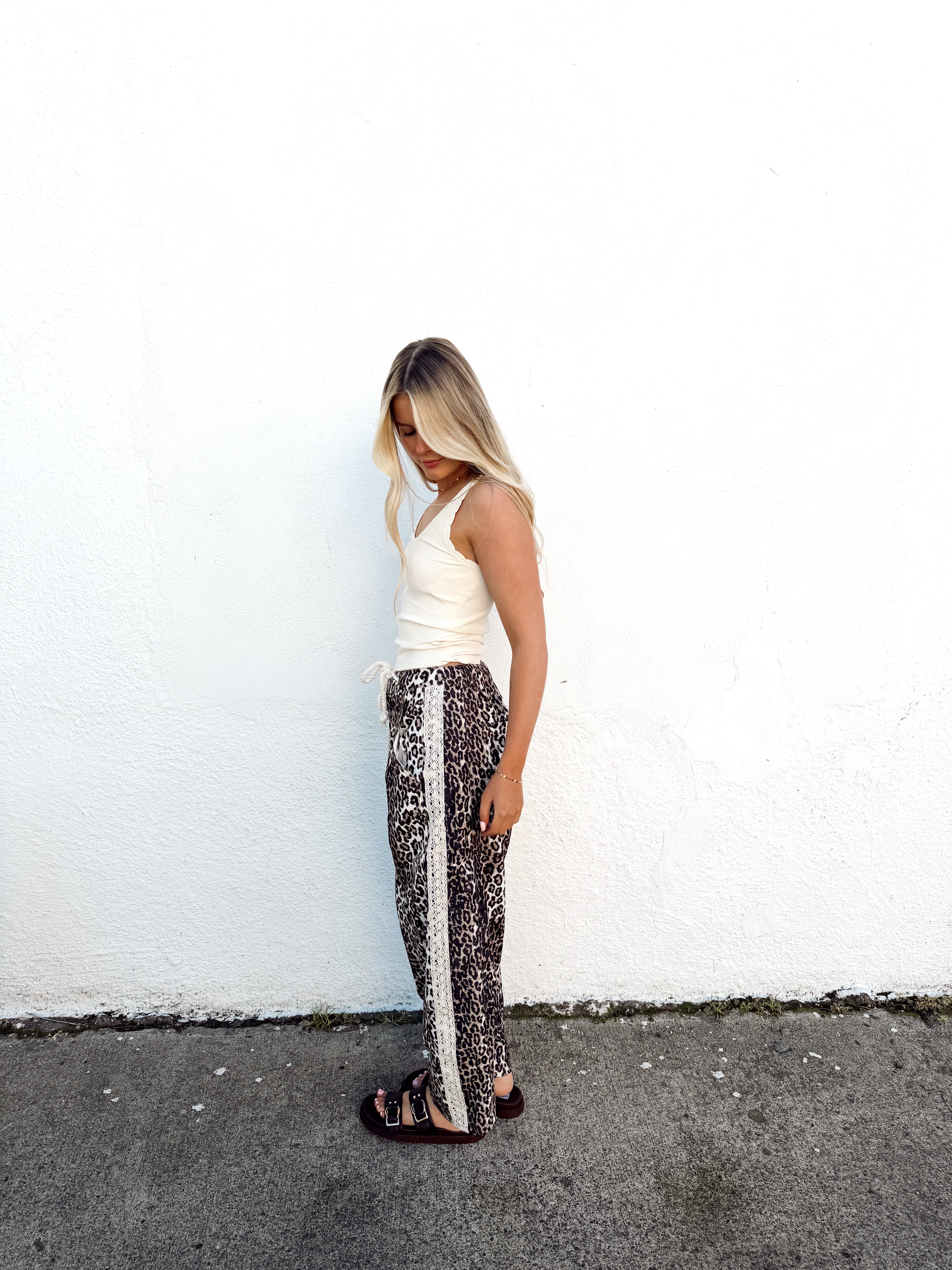Leopard printed pants with a relaxed cropped fit, drawstring waist, and contrast textured side