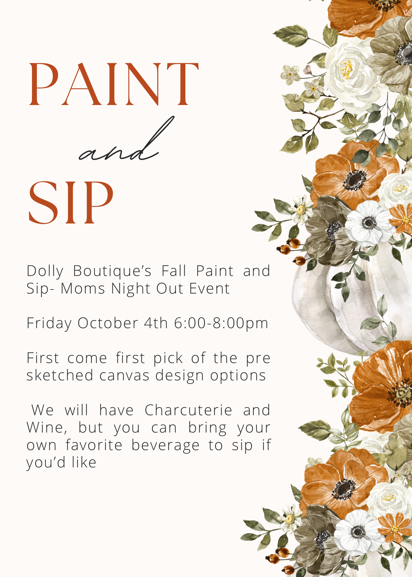 Get your tickets for Dolly Boutique’s Moms Night out Event. Come enjoy an evening out with your favorite Dolls. You don’t have to be an artist this will be a pre drawn canvas you can just go at your own pace and paint for fun. We will have yummy charcuterie for you to snack on as you work on your masterpiece. Take your art home after or we can donate to a local convalescent home to brighten their day.