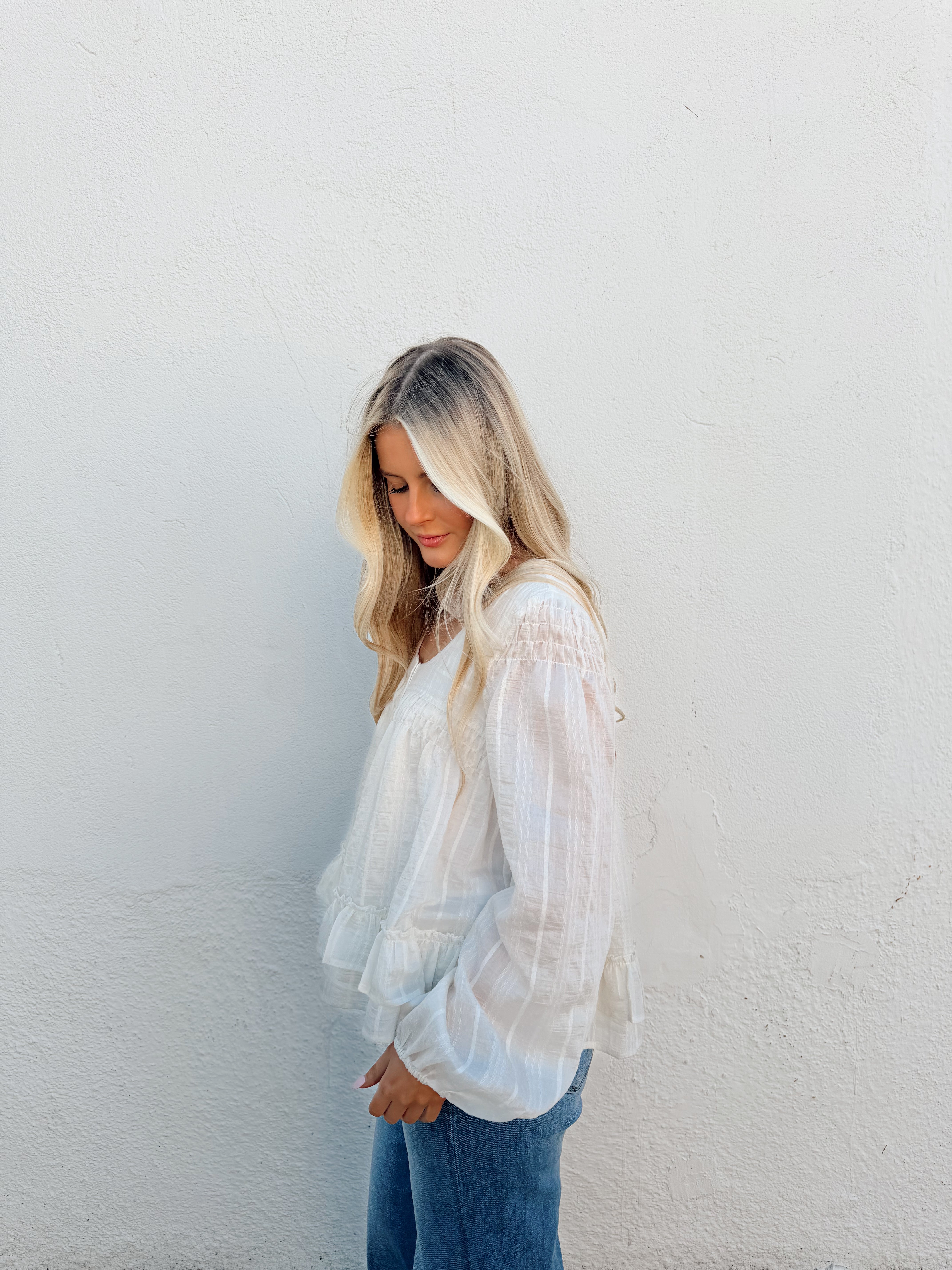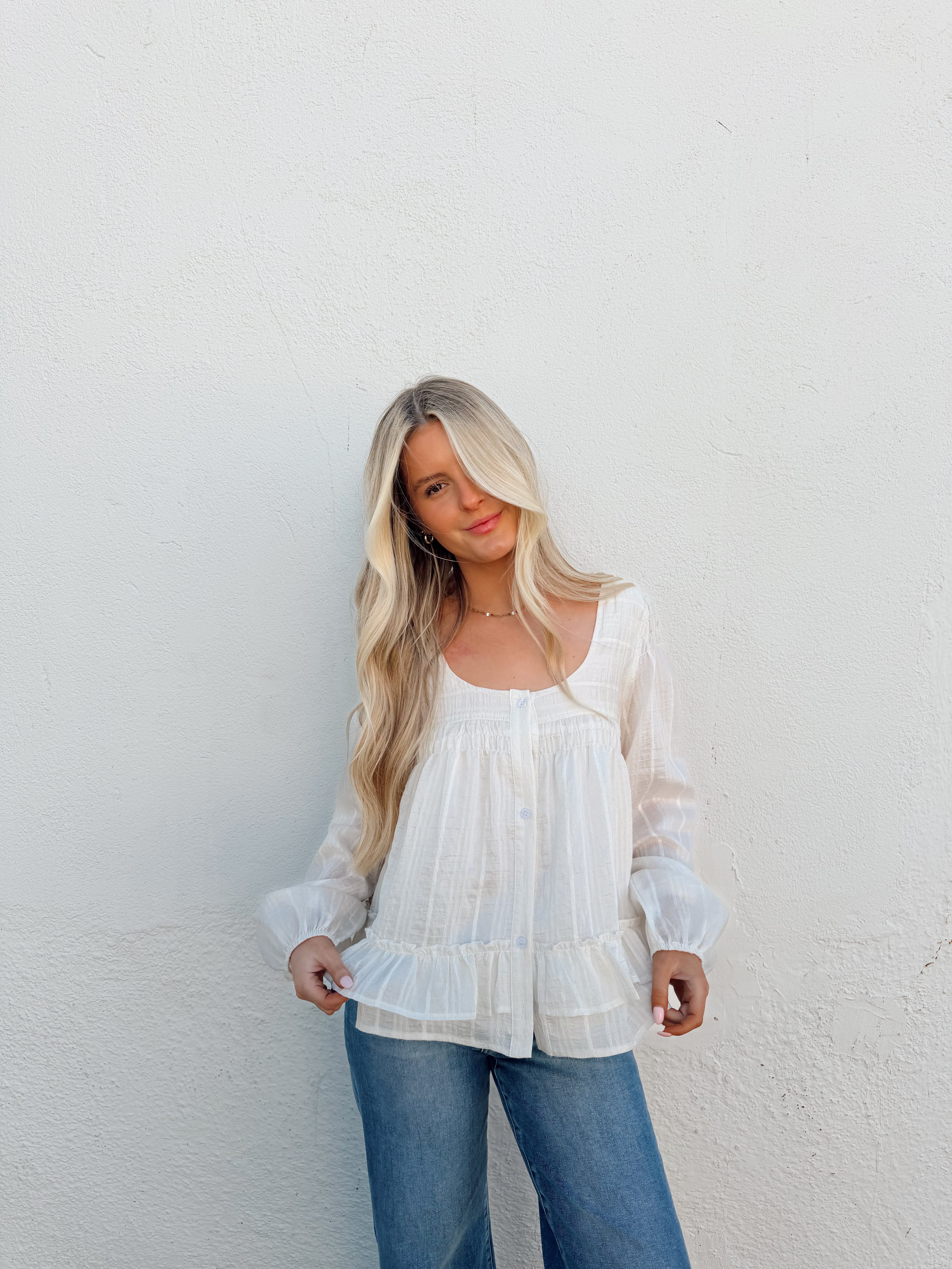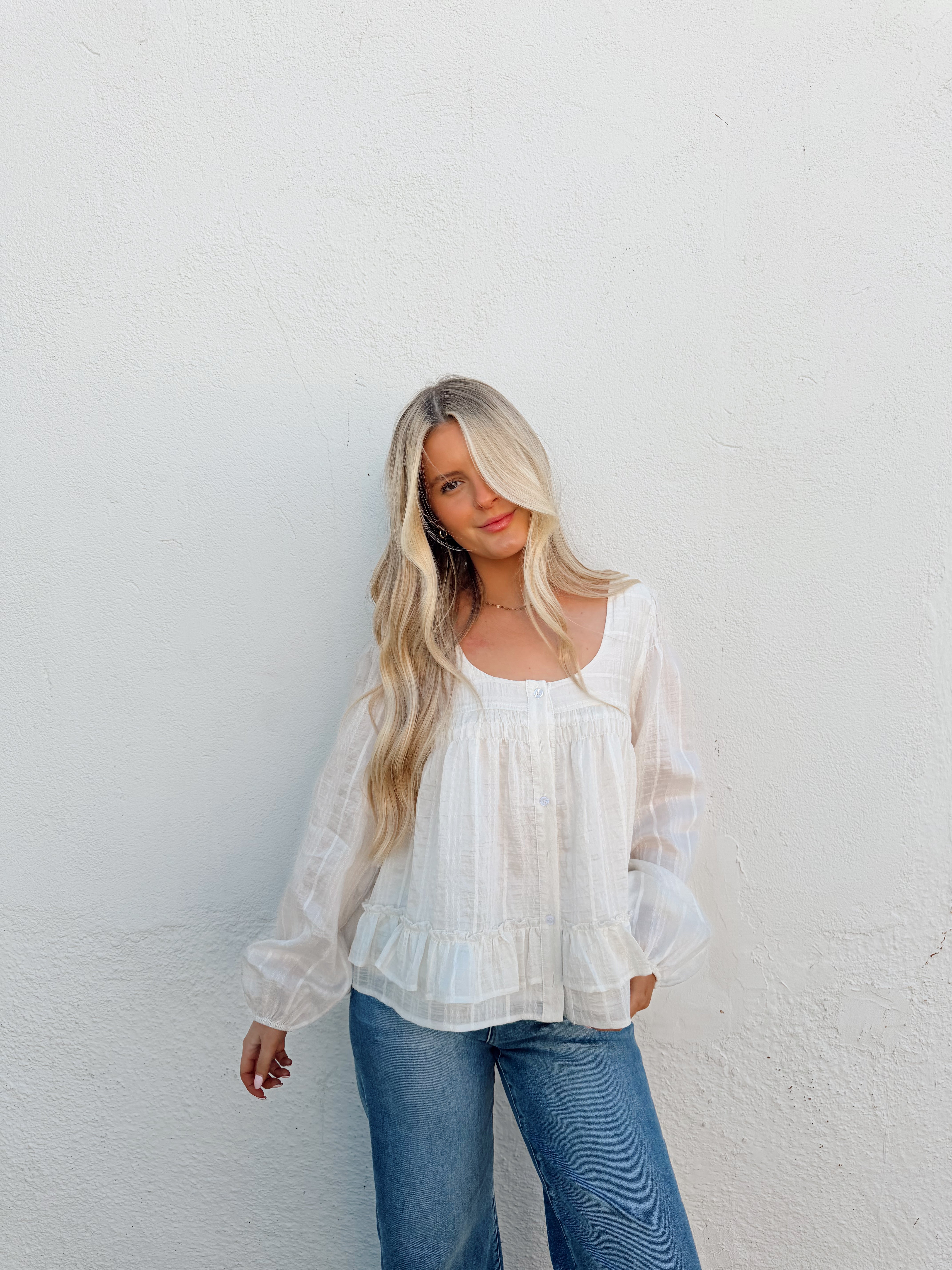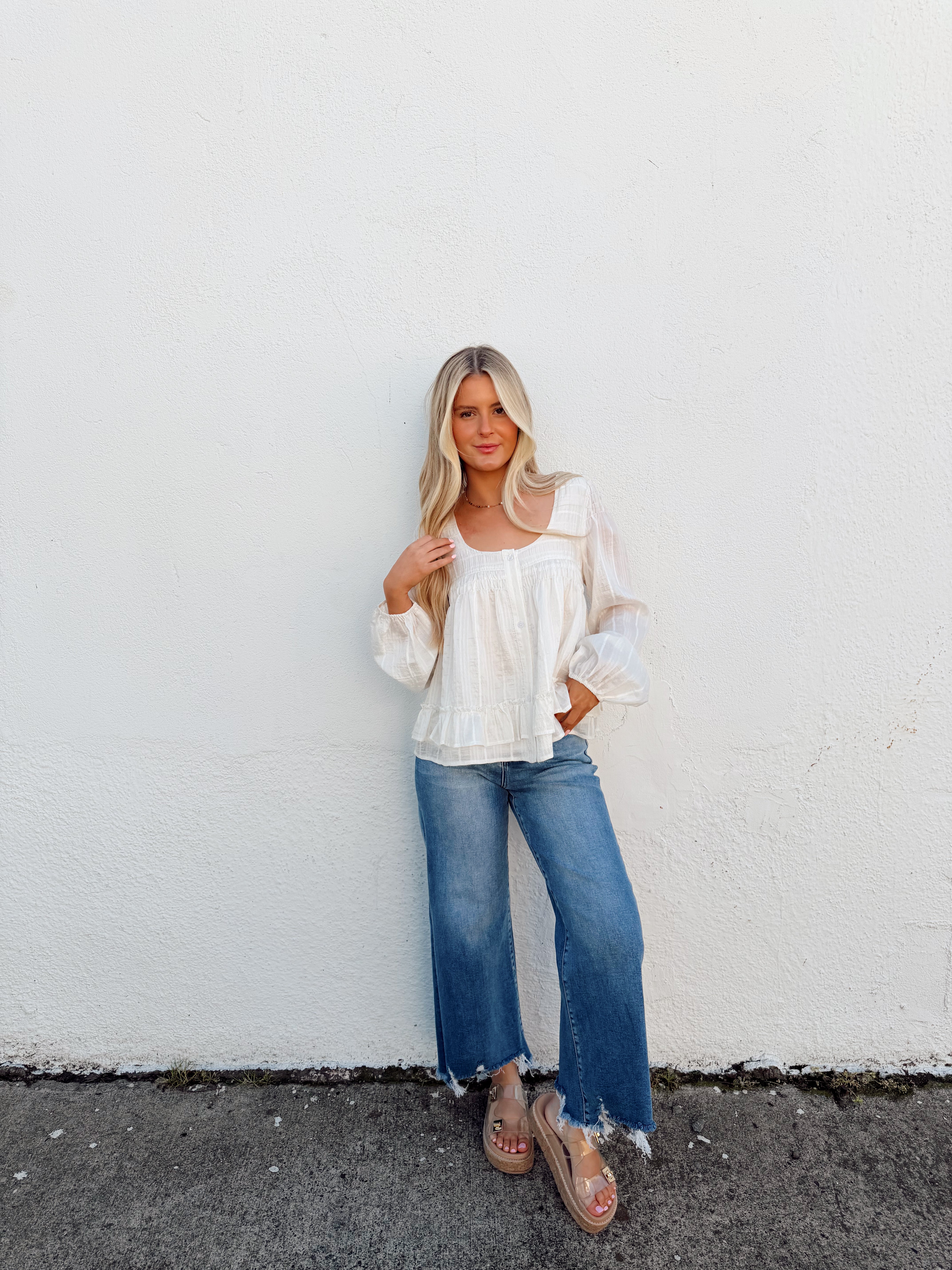 - Long Puff Sleeves: Billowy sleeves with elasticized cuffs for an airy silhouette