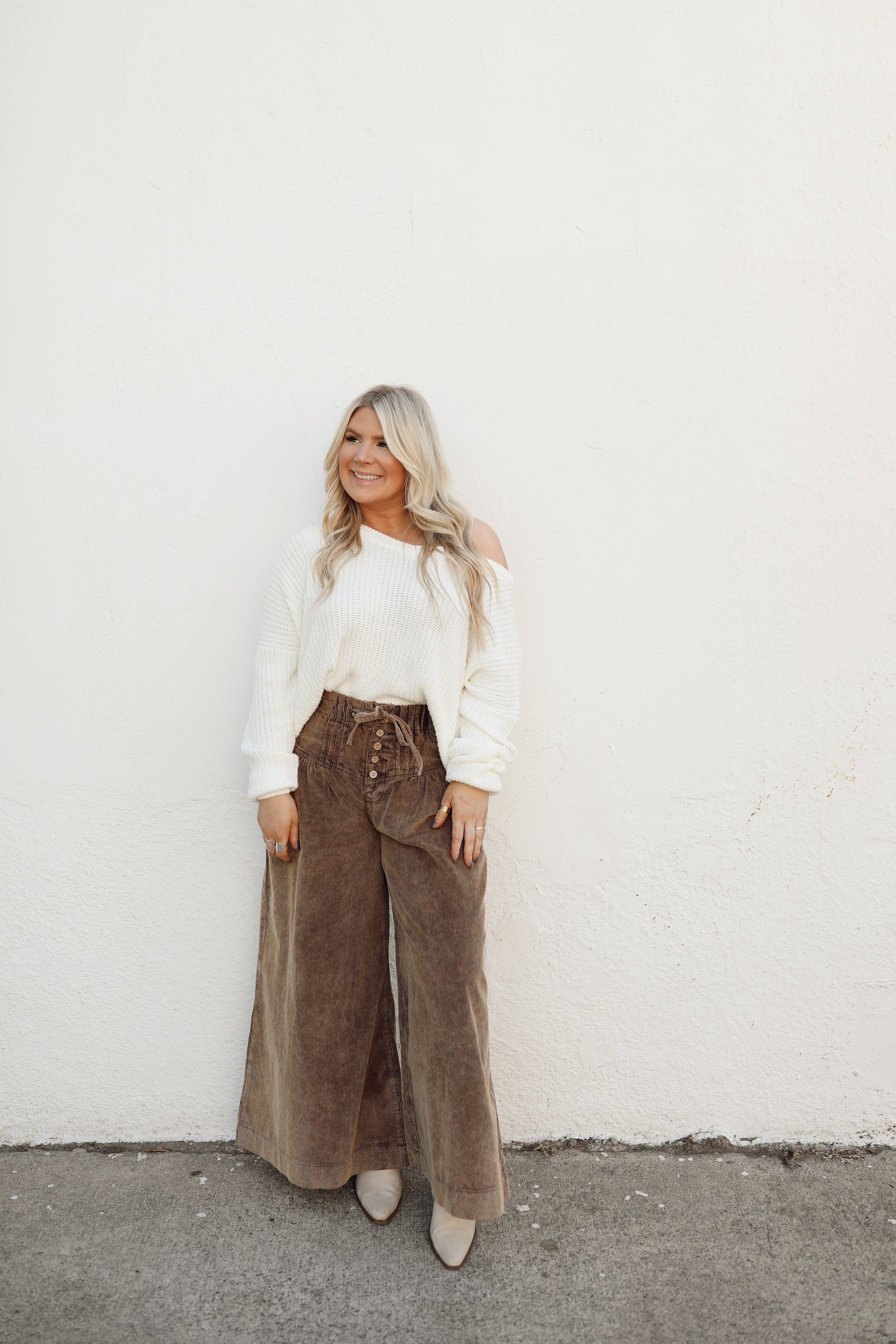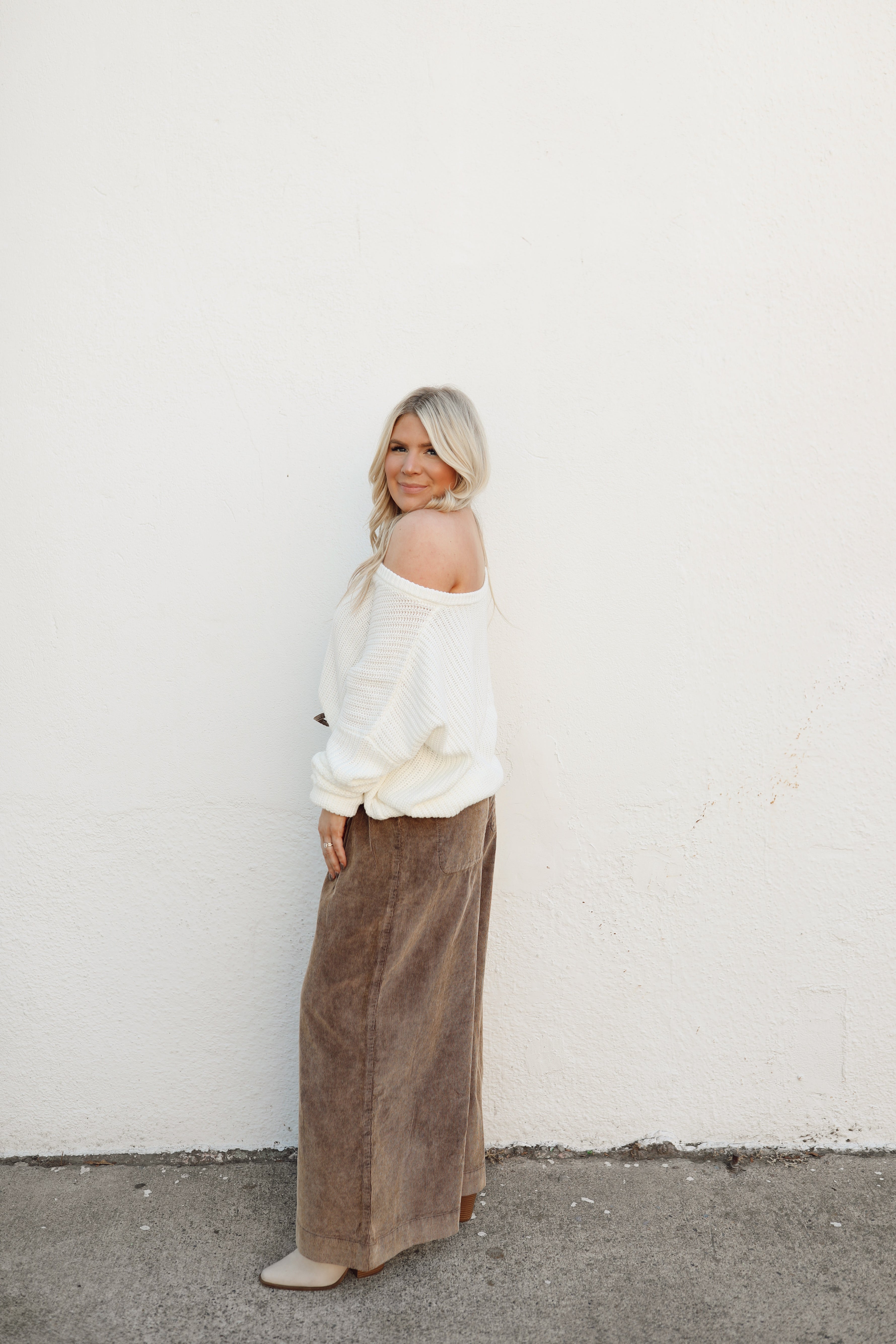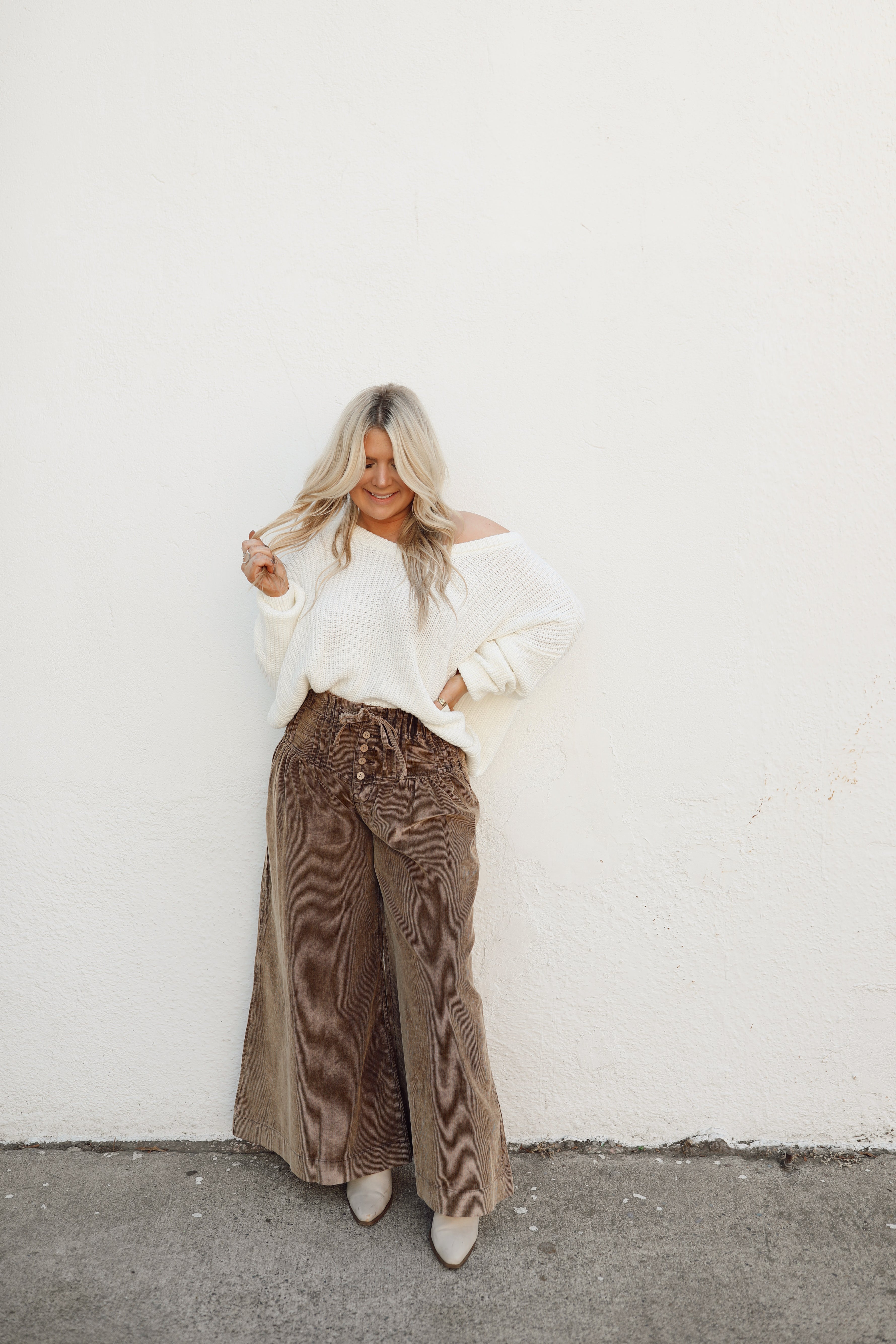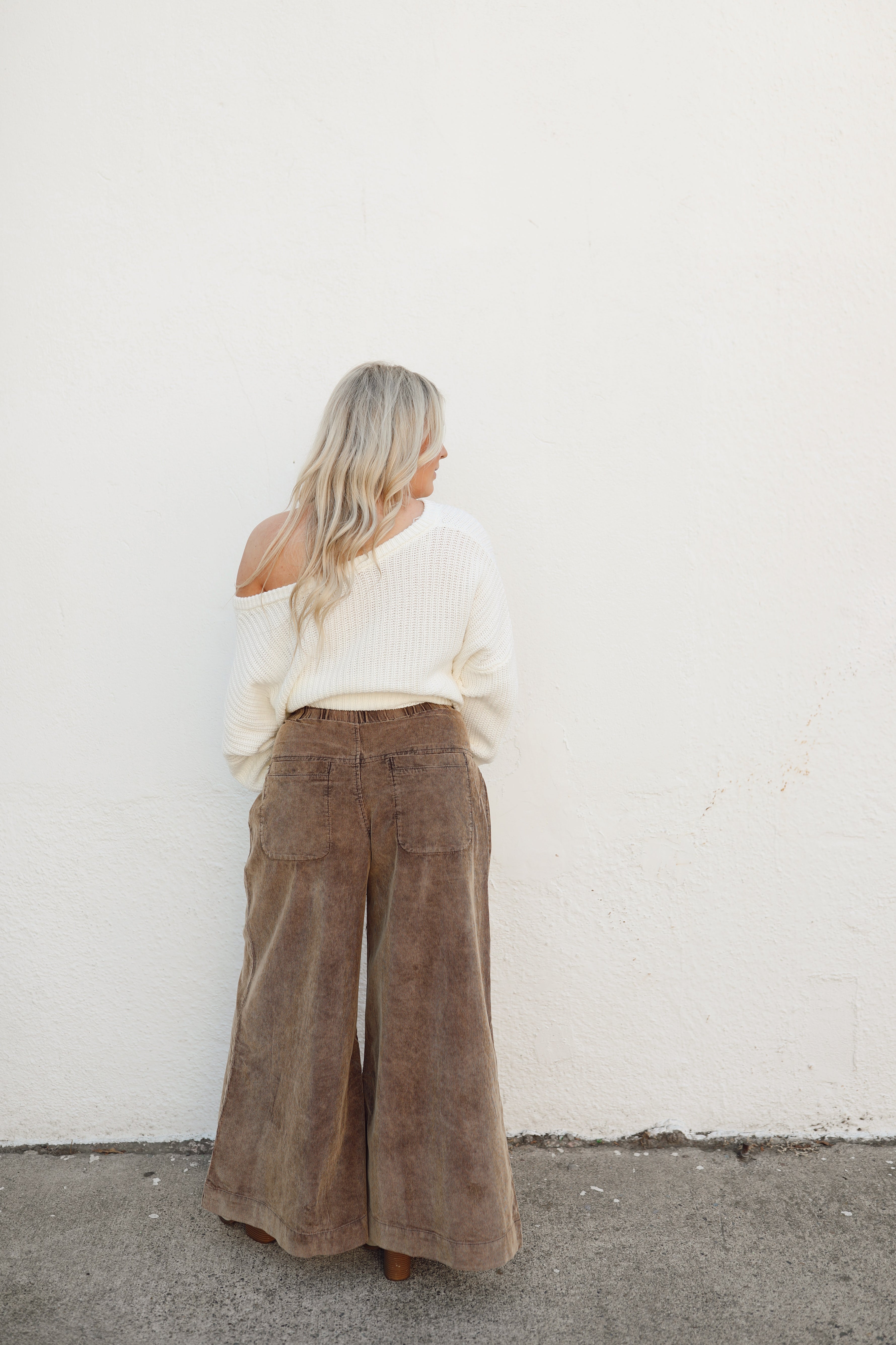 -Mid Rise Corduroy Washed Pleated Wide Leg