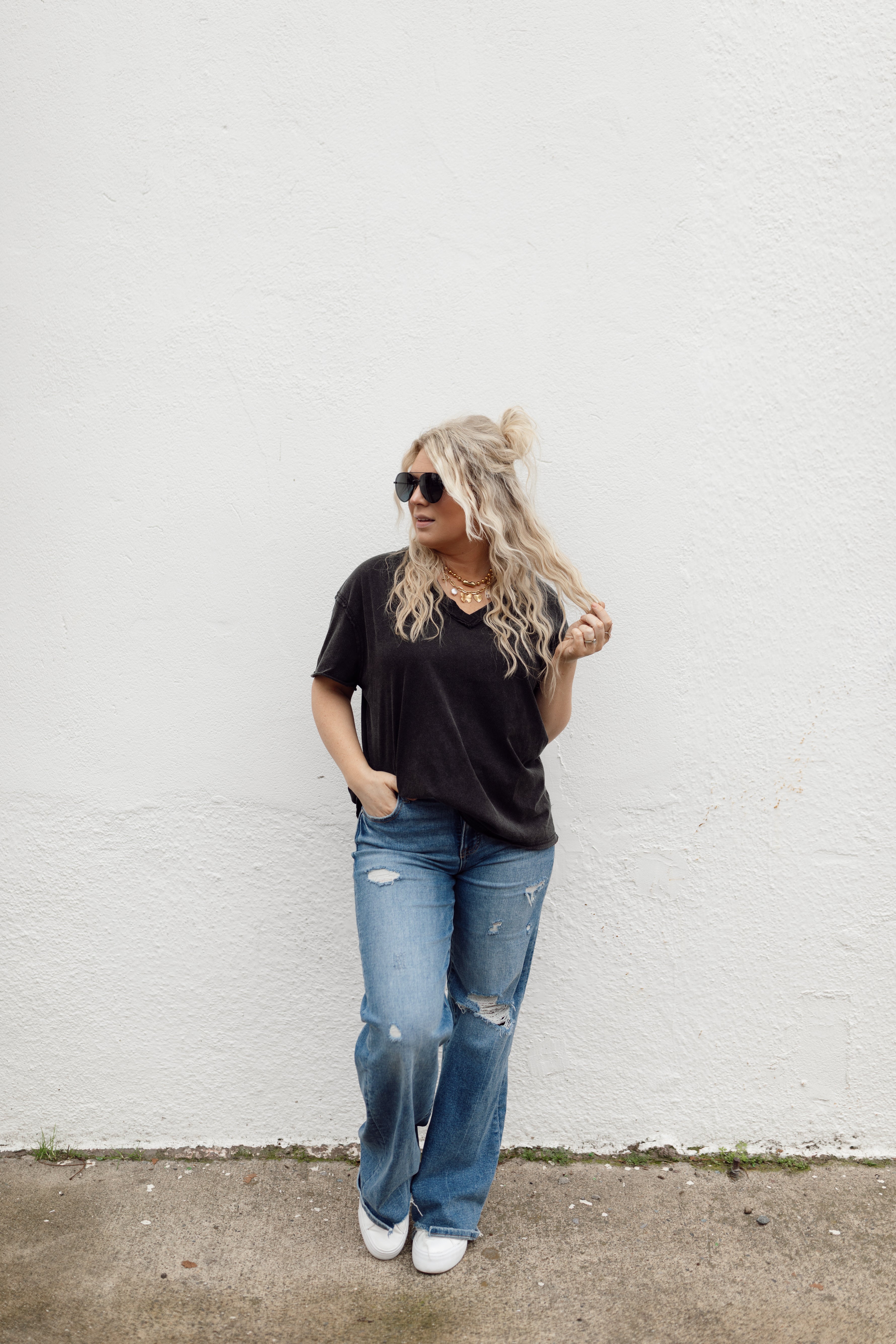 Lauren is in a small; oversized fit
