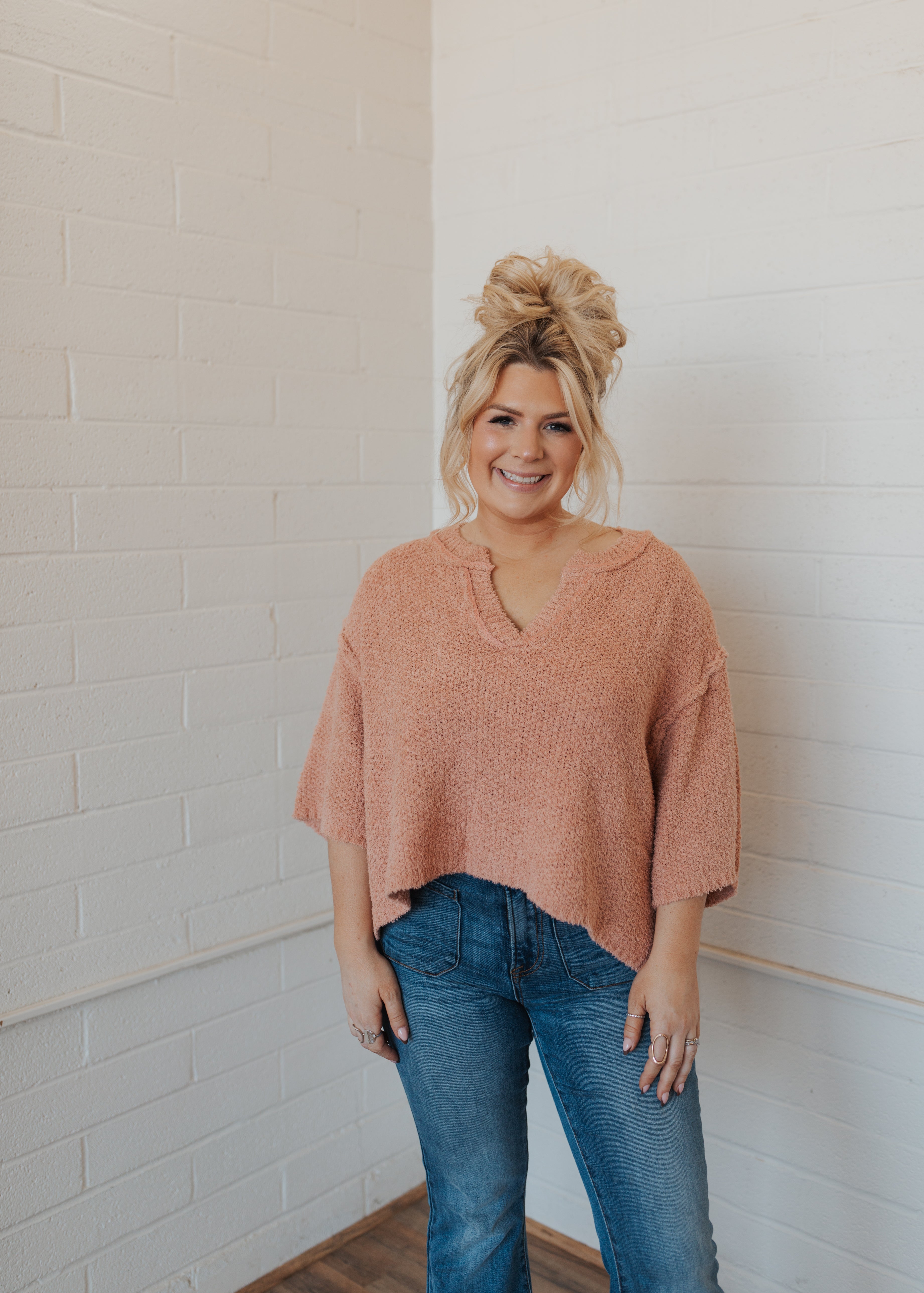 drop shoulder, round neck, textured knit sweater